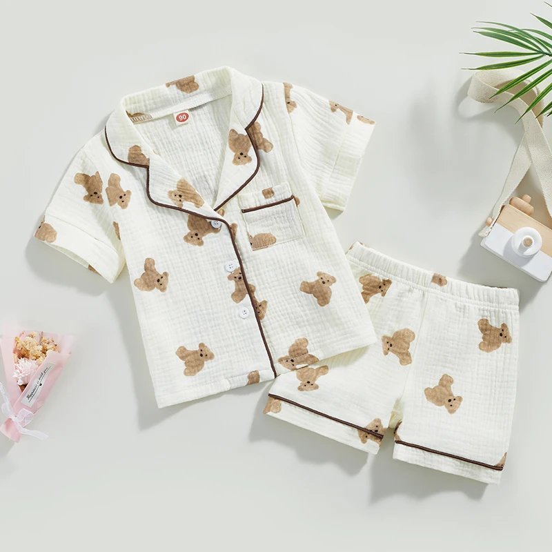 Comprar VISgogo-ropa de dormir para niños y niñas, ropa de dormir de verano con estampado de oso, camiseta de manga corta con botones y pantalones cortos elásticos, pijama