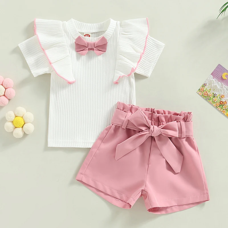 Ropa de verano para niña pequeña conjuntos de 2 piezas, camiseta de manga corta Ribbed Ruffled Bowknot + Pantalones cortos con cinturón
