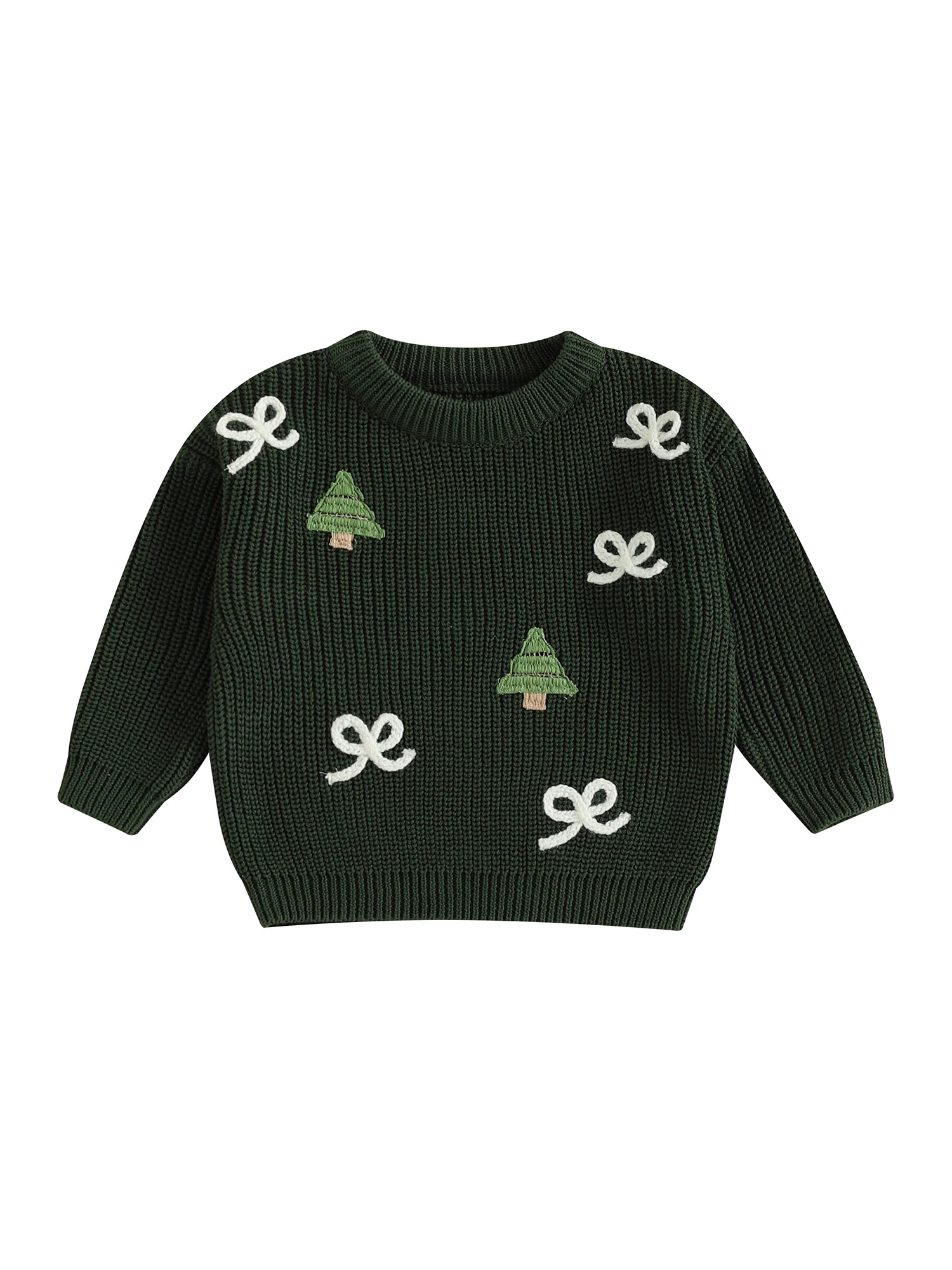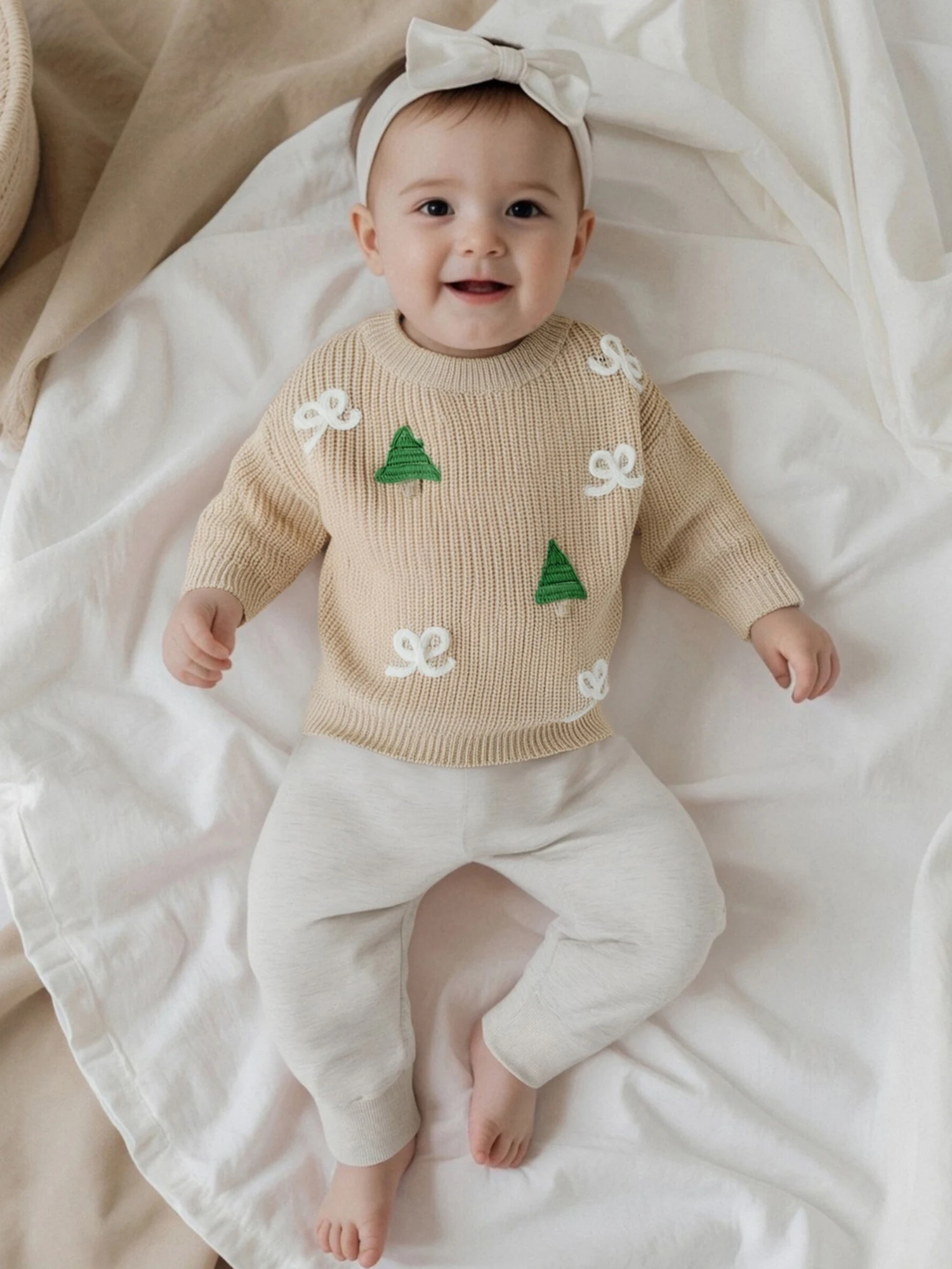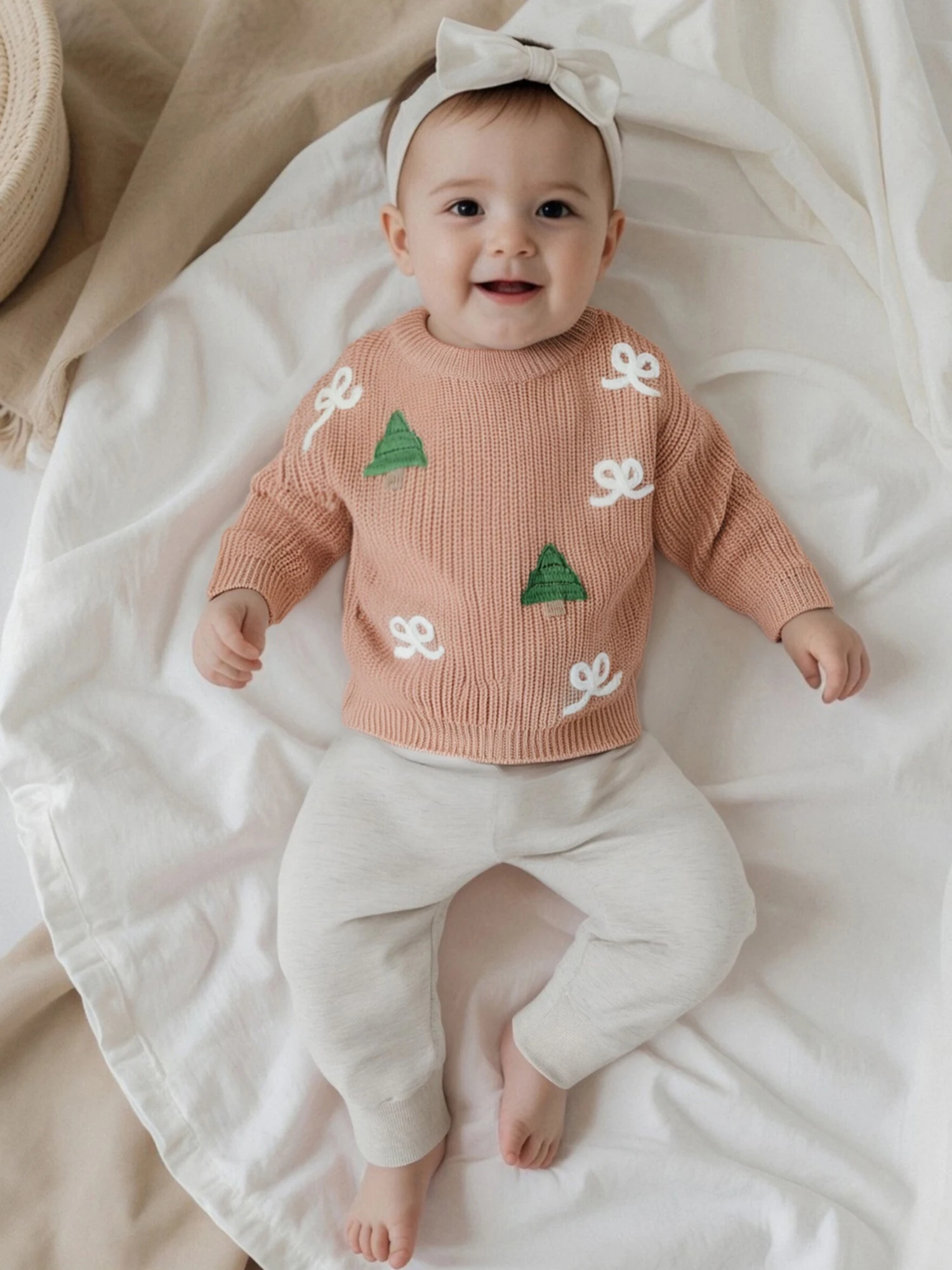 Especificaciones: Material: 95% algodón y 5% poliéster Color: multicolor Tamaño: 3-6 meses/6-9 meses/9-12 meses/12-18 meses/18-24 meses/2-3 años/3-4 años Patrón: Árbol de Navidad con lazo bordado Manga: manga larga Cuello: cuello redondo Género: bebé pequeño