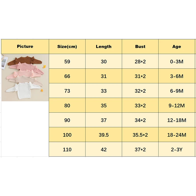 Tamaño (pulgadas) 59 Longitud: 11,81 Busto: 22,05 Edad recomendada: 0-3 meses 66 Longitud: 12,20 Busto: 24,41 Edad recomendada: 3-6 meses 73 Longitud: 12,99 Busto: 25,20 Edad recomendada: 6-9 meses 80 Longitud: 13,78 Busto: 25,98 Edad recomendada: 9-12 meses 90 Longitud: 14,57 Busto: 26,77 Edad recomendada: 12-18 meses 100 Longitud: 15,55 Busto: 27,95 Edad recomendada: 18-24 meses 110 Largo: 16,54 Busto: 29,13 Edad recomendada: 2-3 años