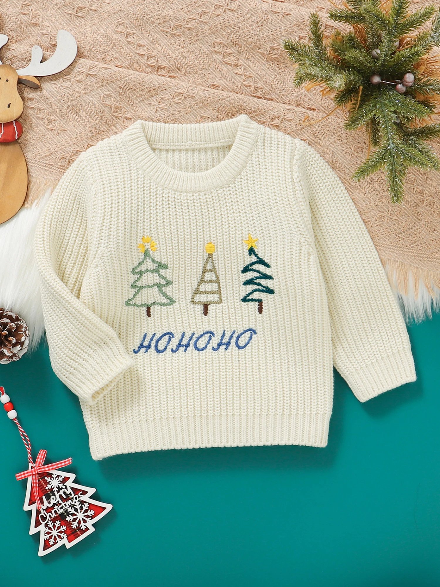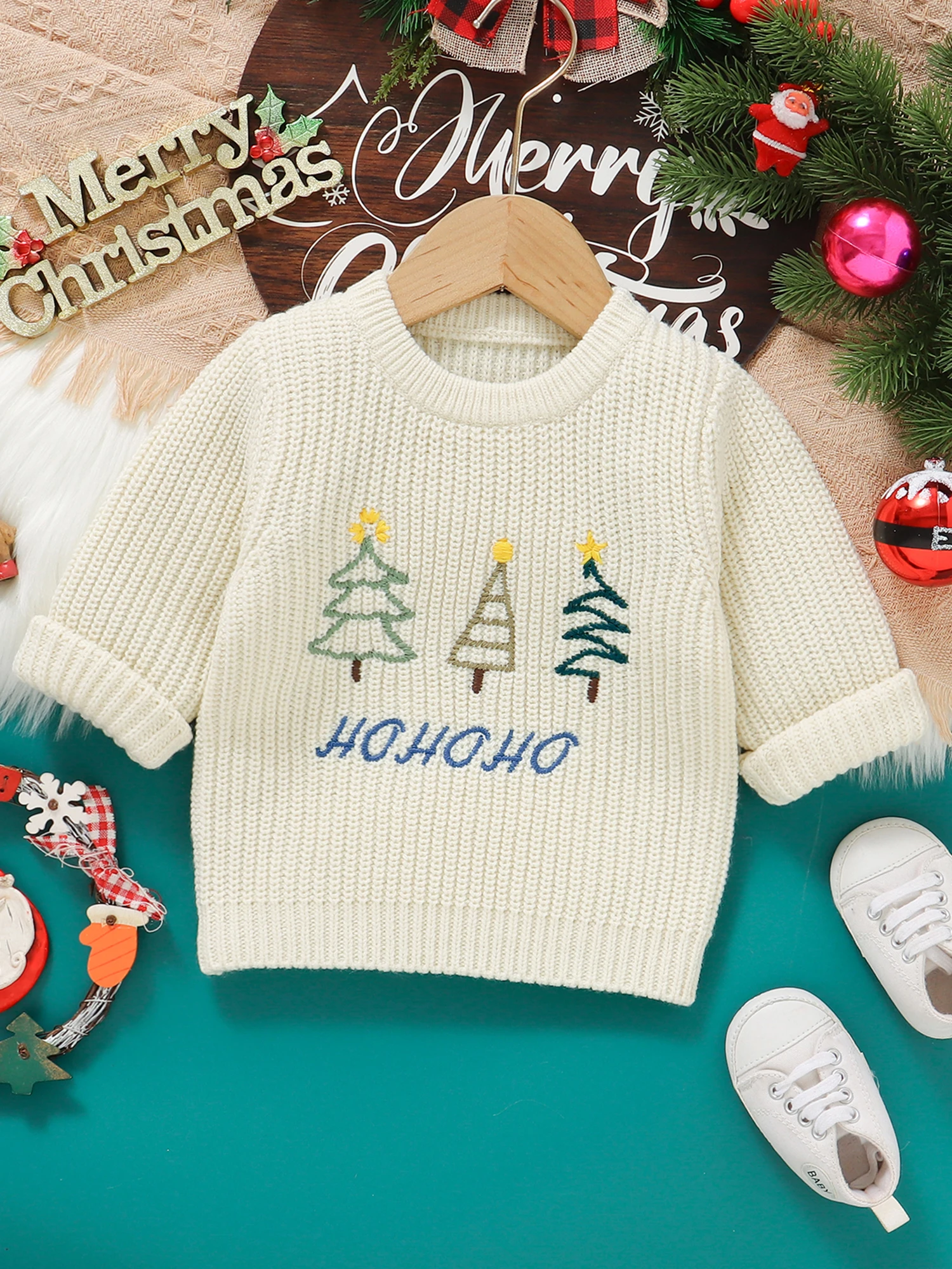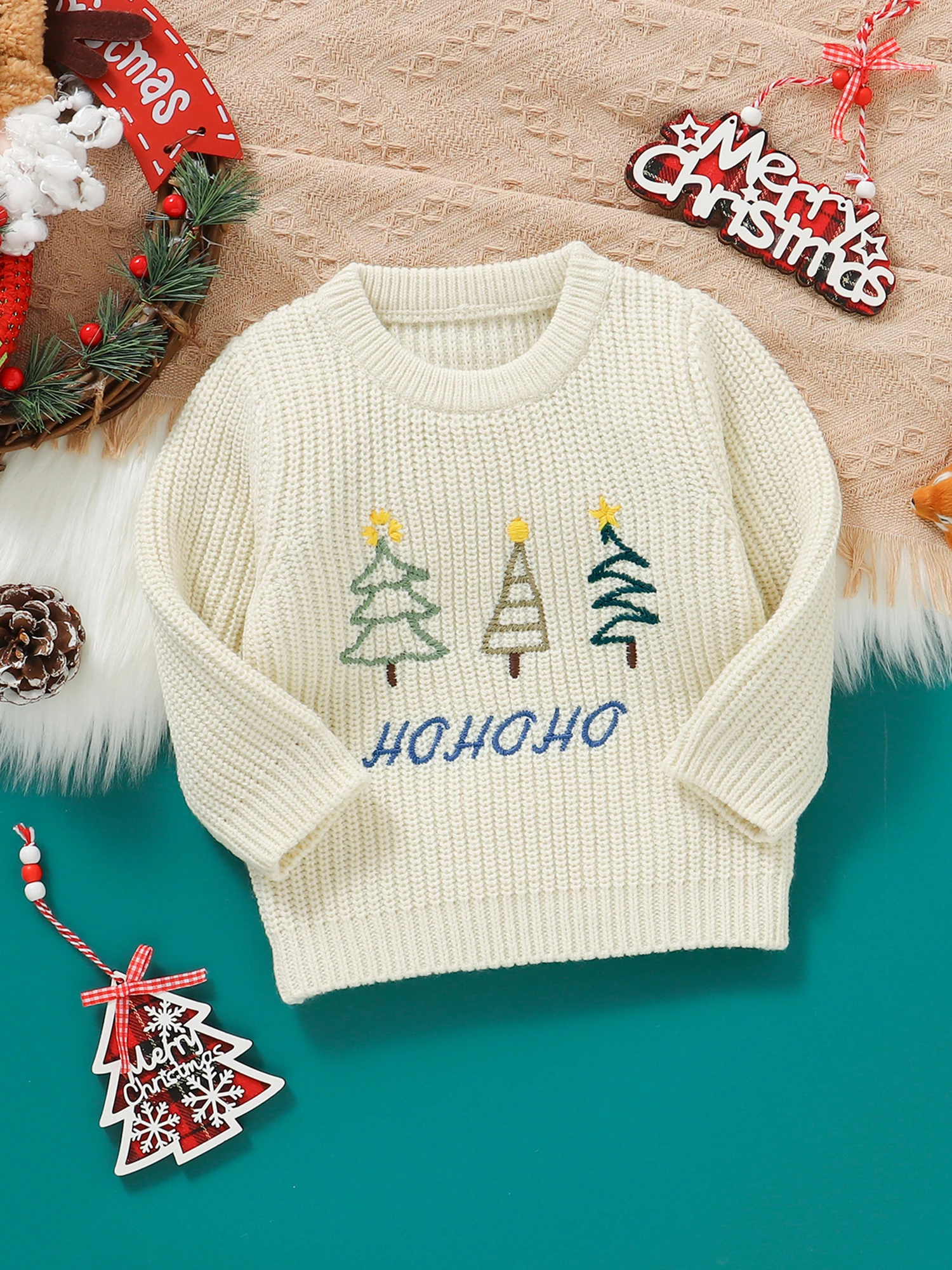 Especificaciones: Tela: 100% Acrílico Estilo: Casual Patrón: Árbol de Navidad, Letra, Alce, Bordado de sombrero navideño Temporada: invierno Manga: manga larga Cuello: cuello redondo