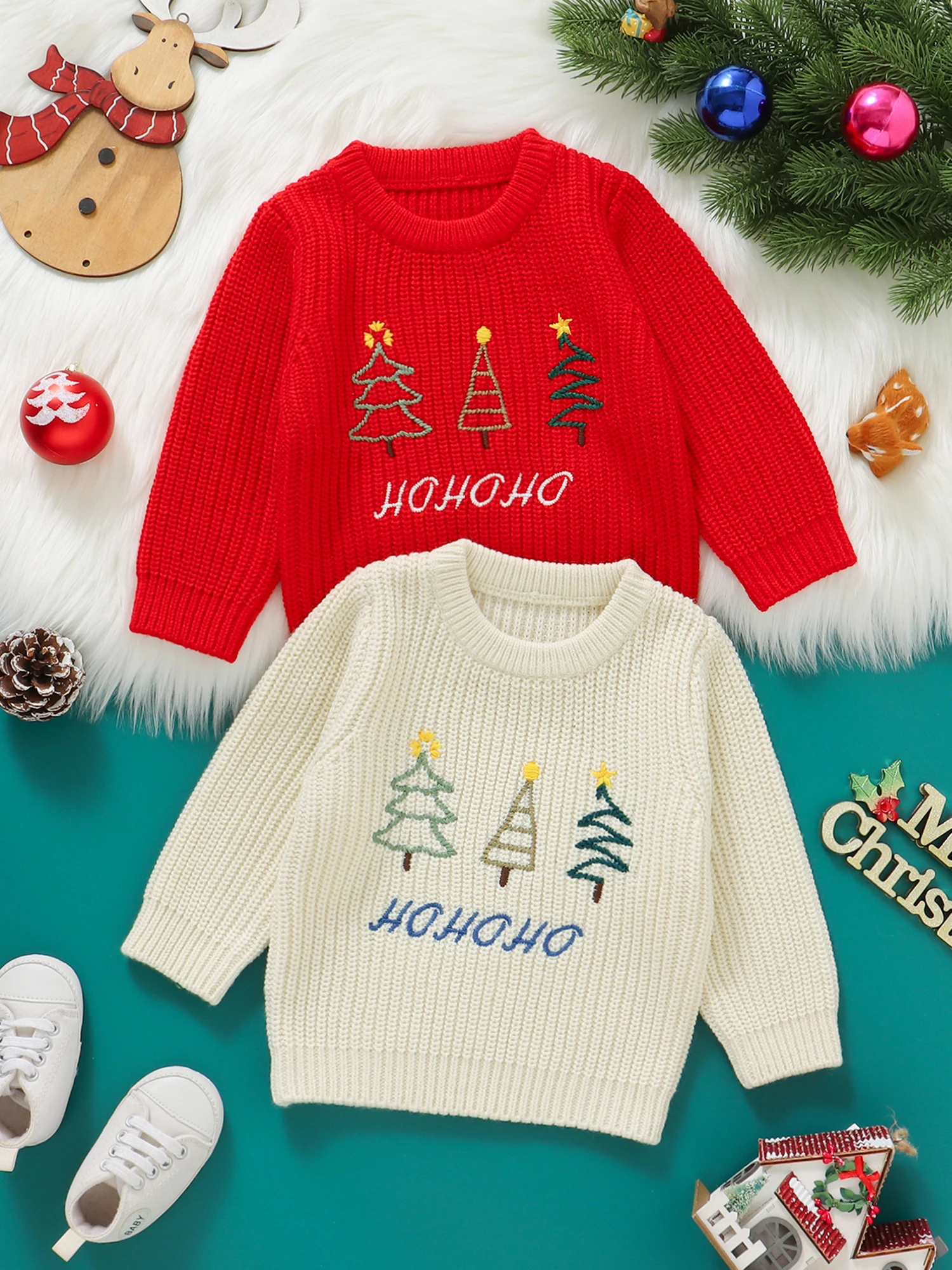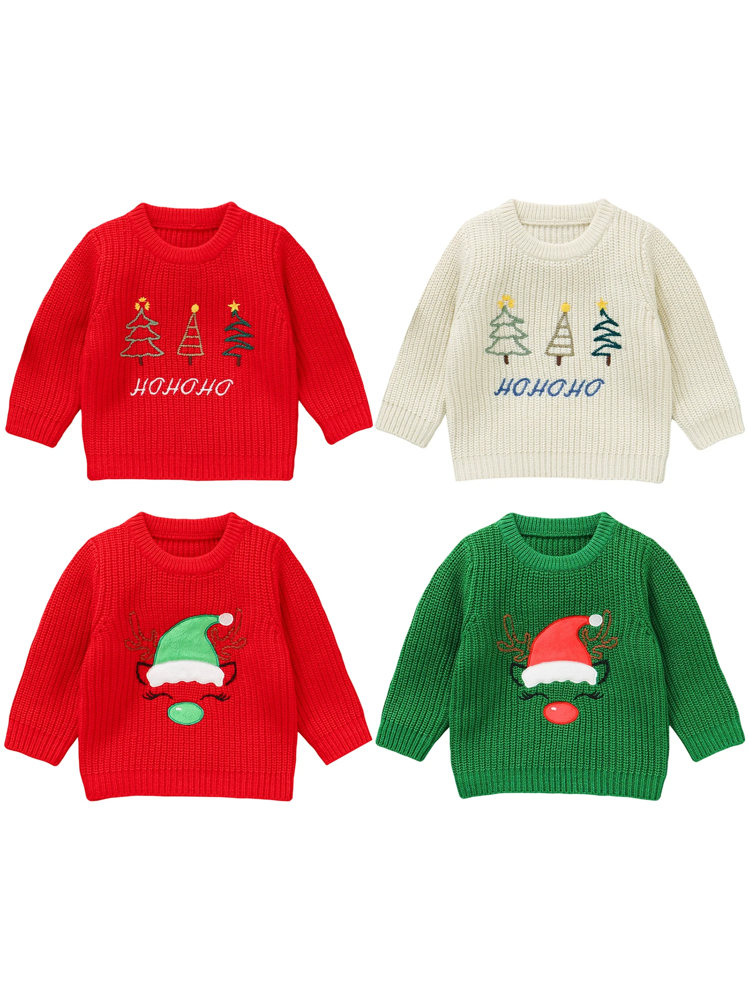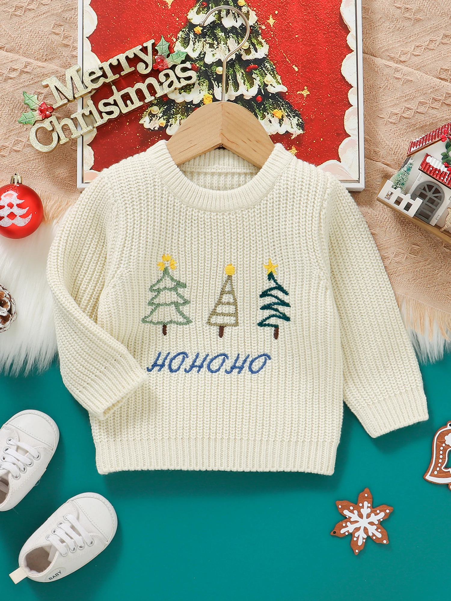 Especificaciones: Tela: 100% Acrílico Estilo: Casual Patrón: Árbol de Navidad, Letra, Alce, Bordado de sombrero navideño Temporada: invierno Manga: manga larga Cuello: cuello redondo