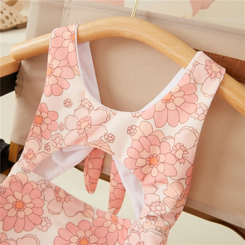 Traje de baño de verano para niñas pequeñas Traje de baño hueco con estampado floral/Concha sin mangas