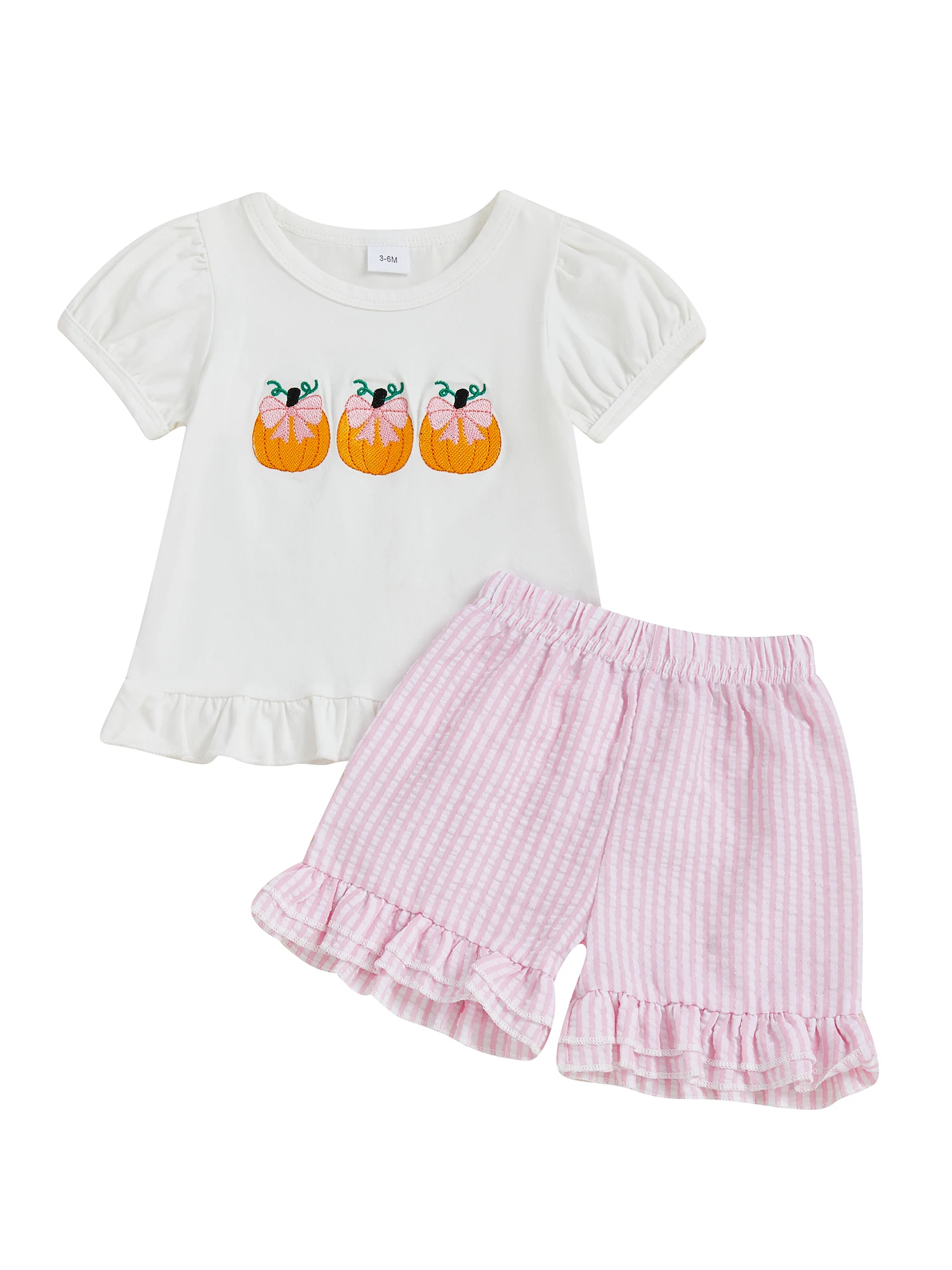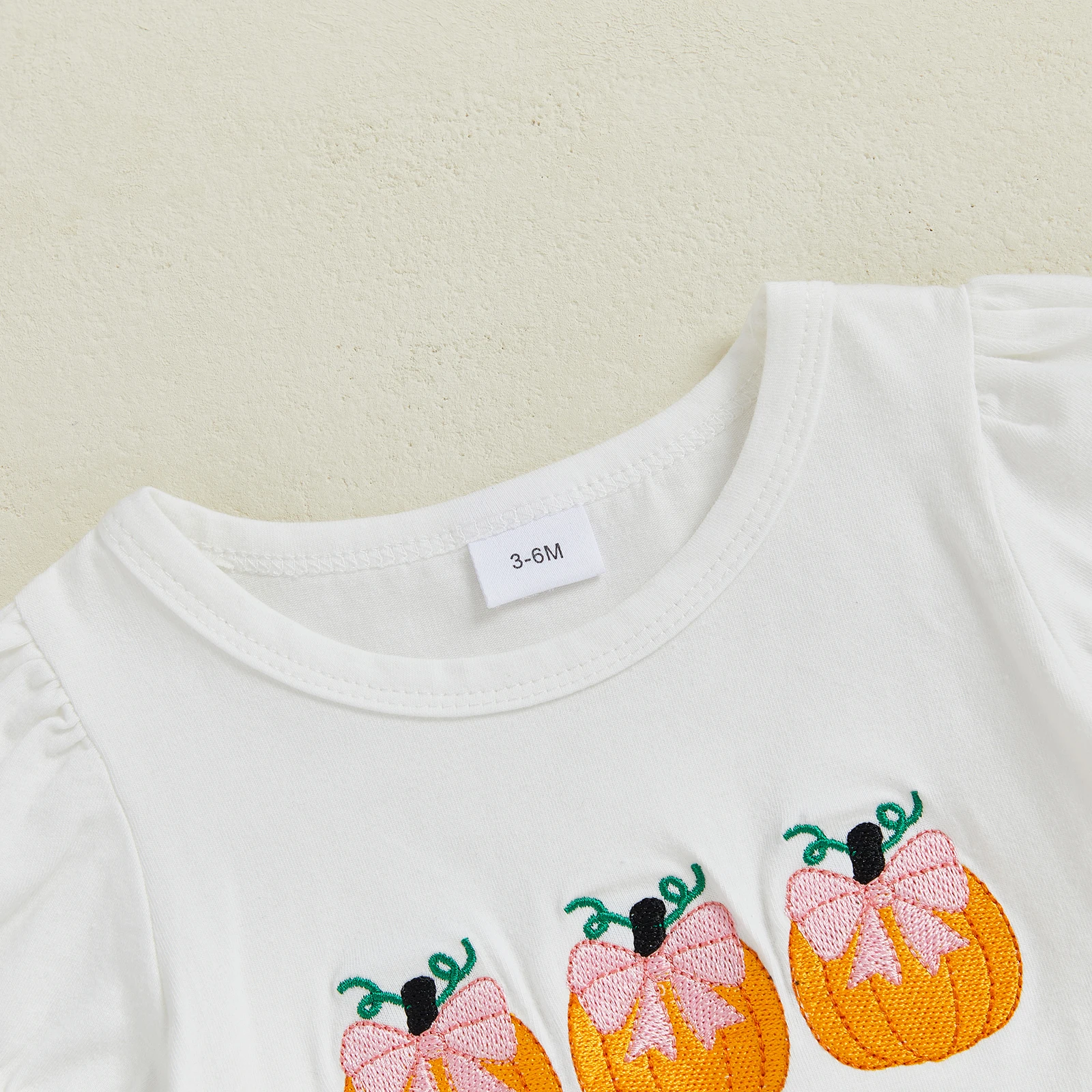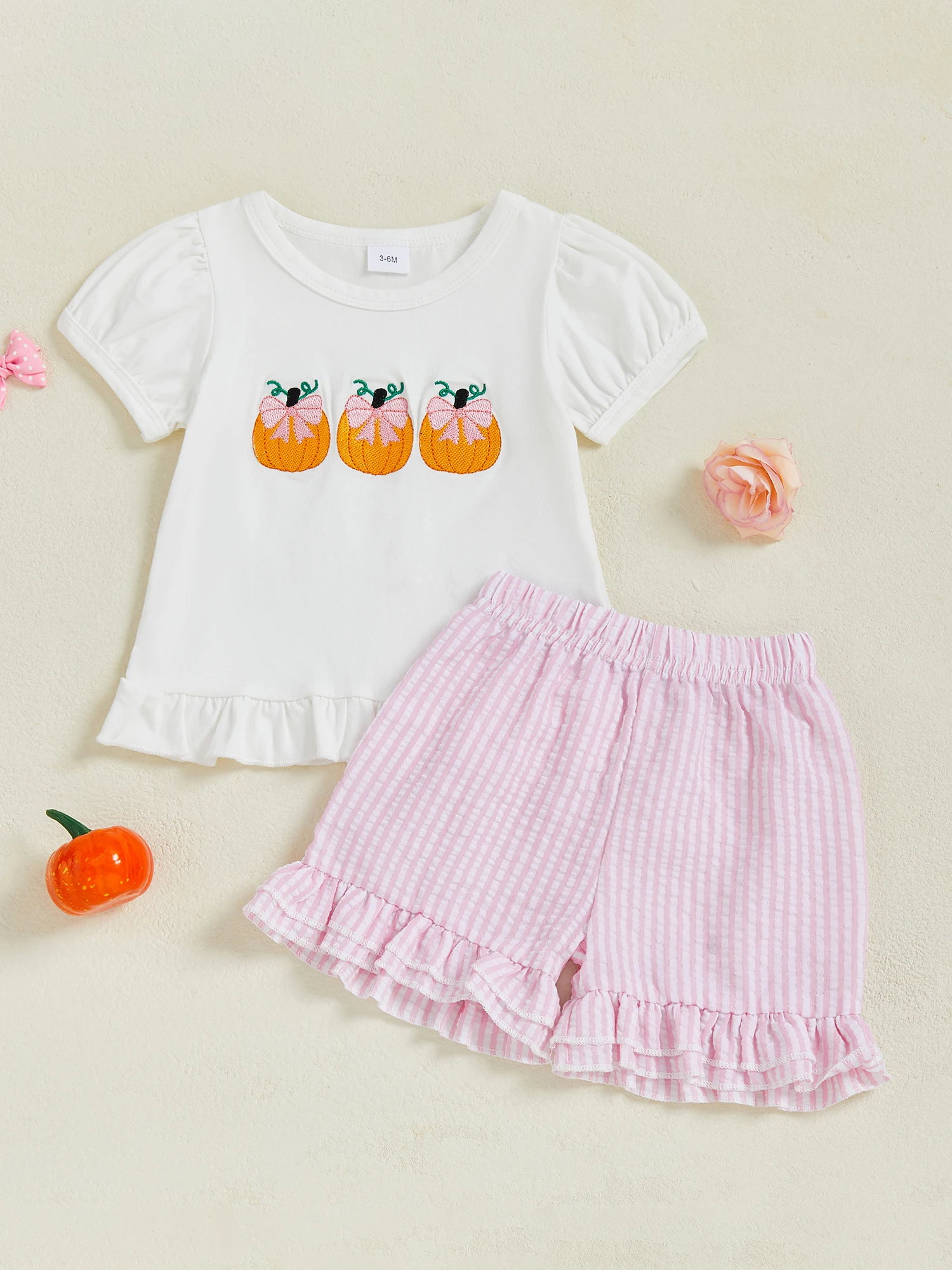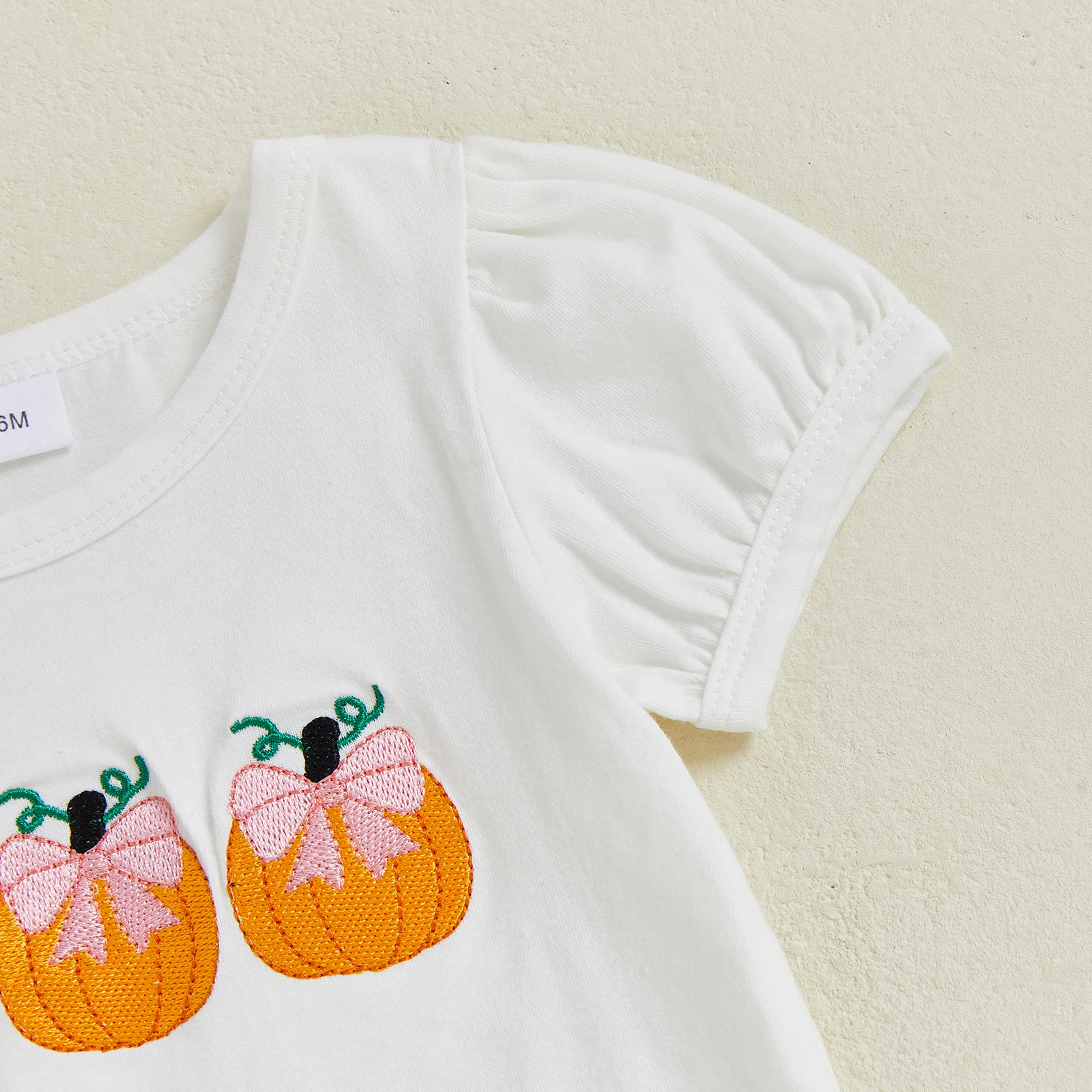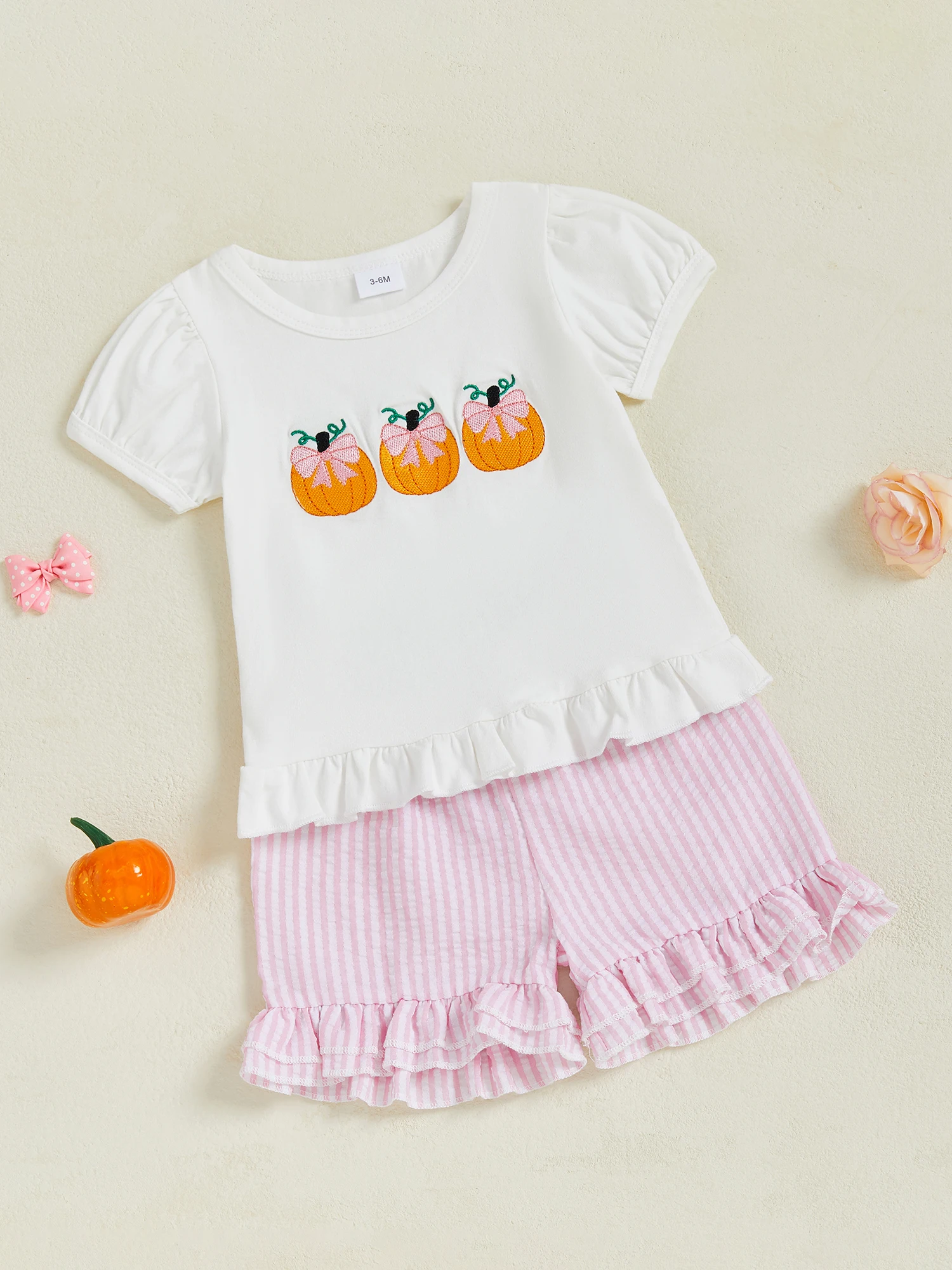 Conjunto de 2 piezas para bebé niña, traje de Halloween con lazo y calabaza bordada, Tops de manga corta, pantalones cortos con volantes en la cintura elástica a rayas
