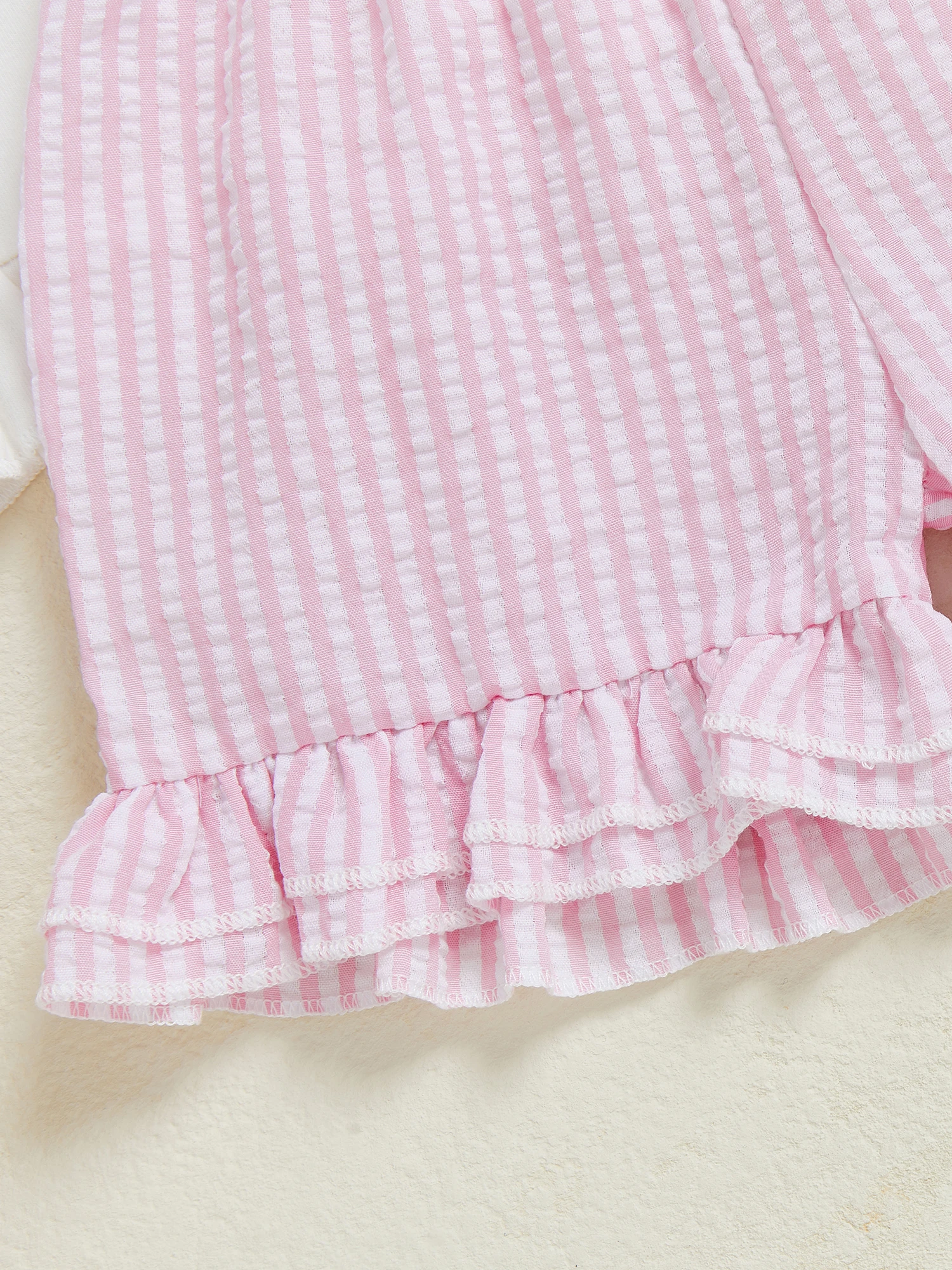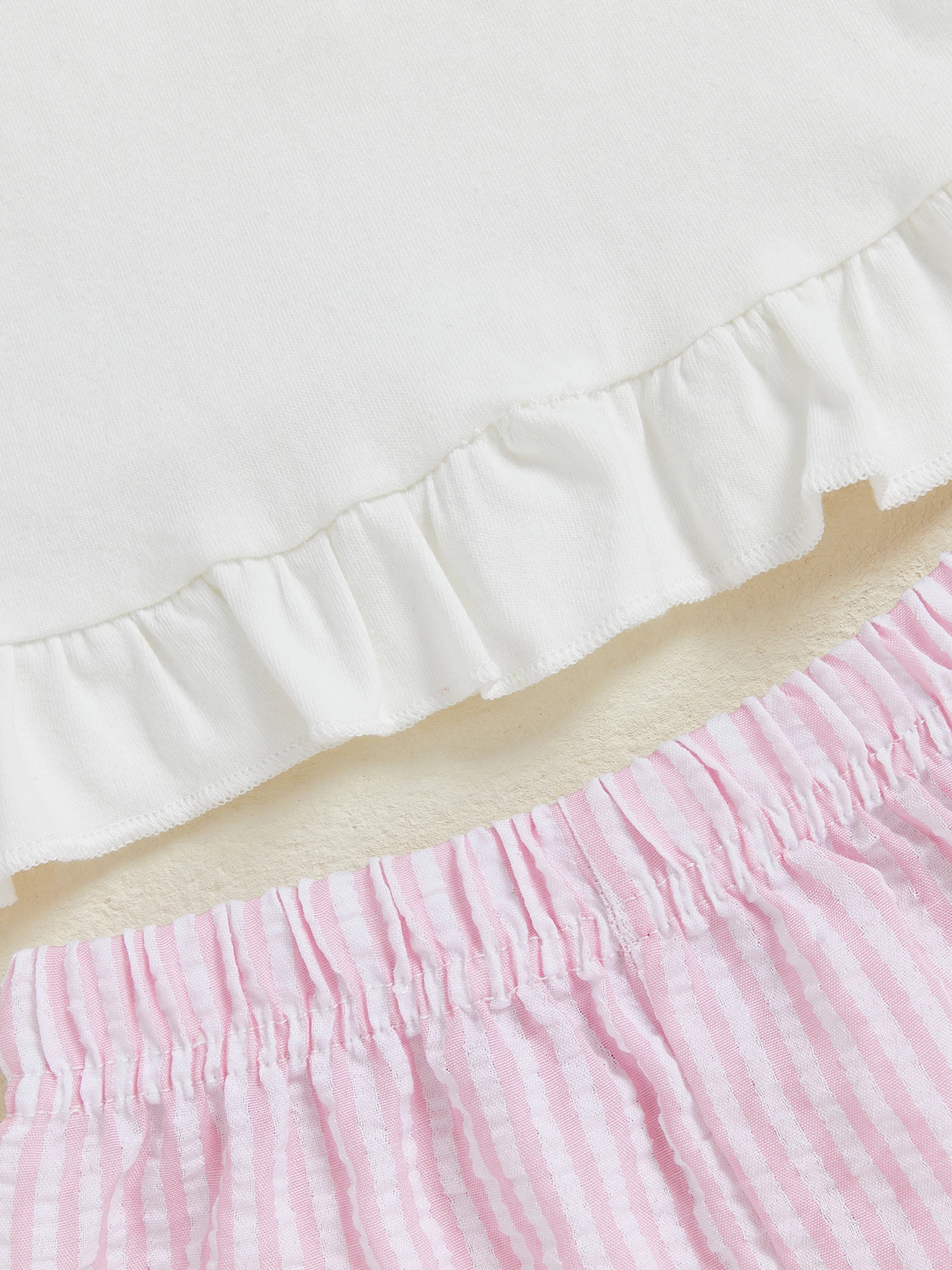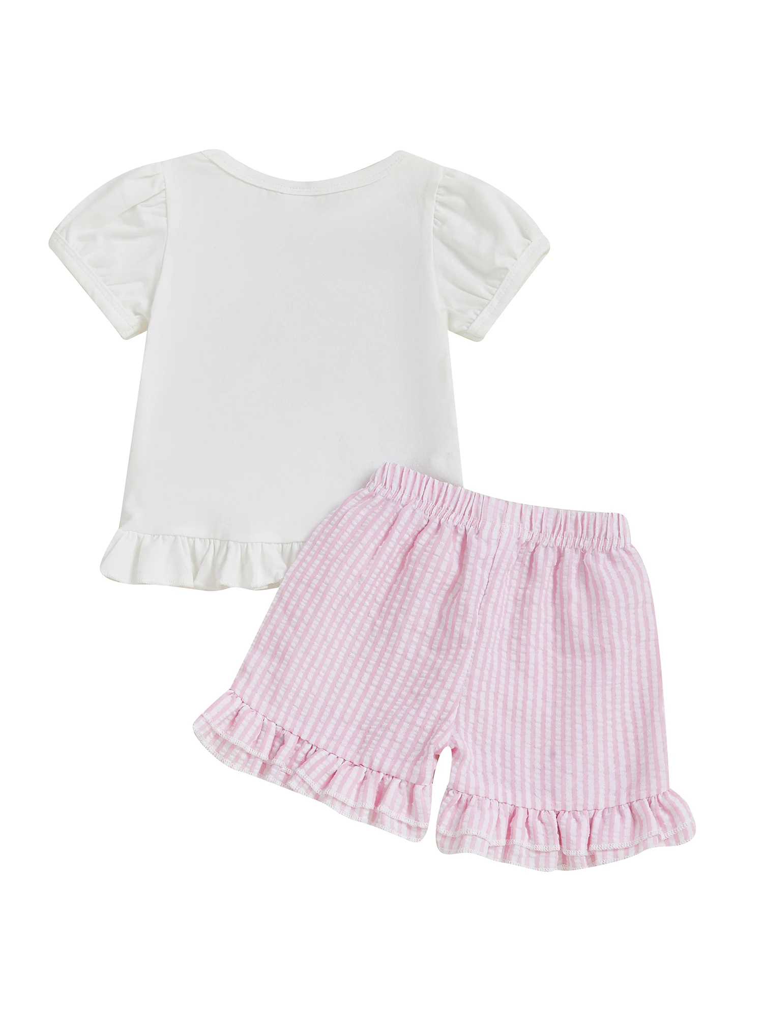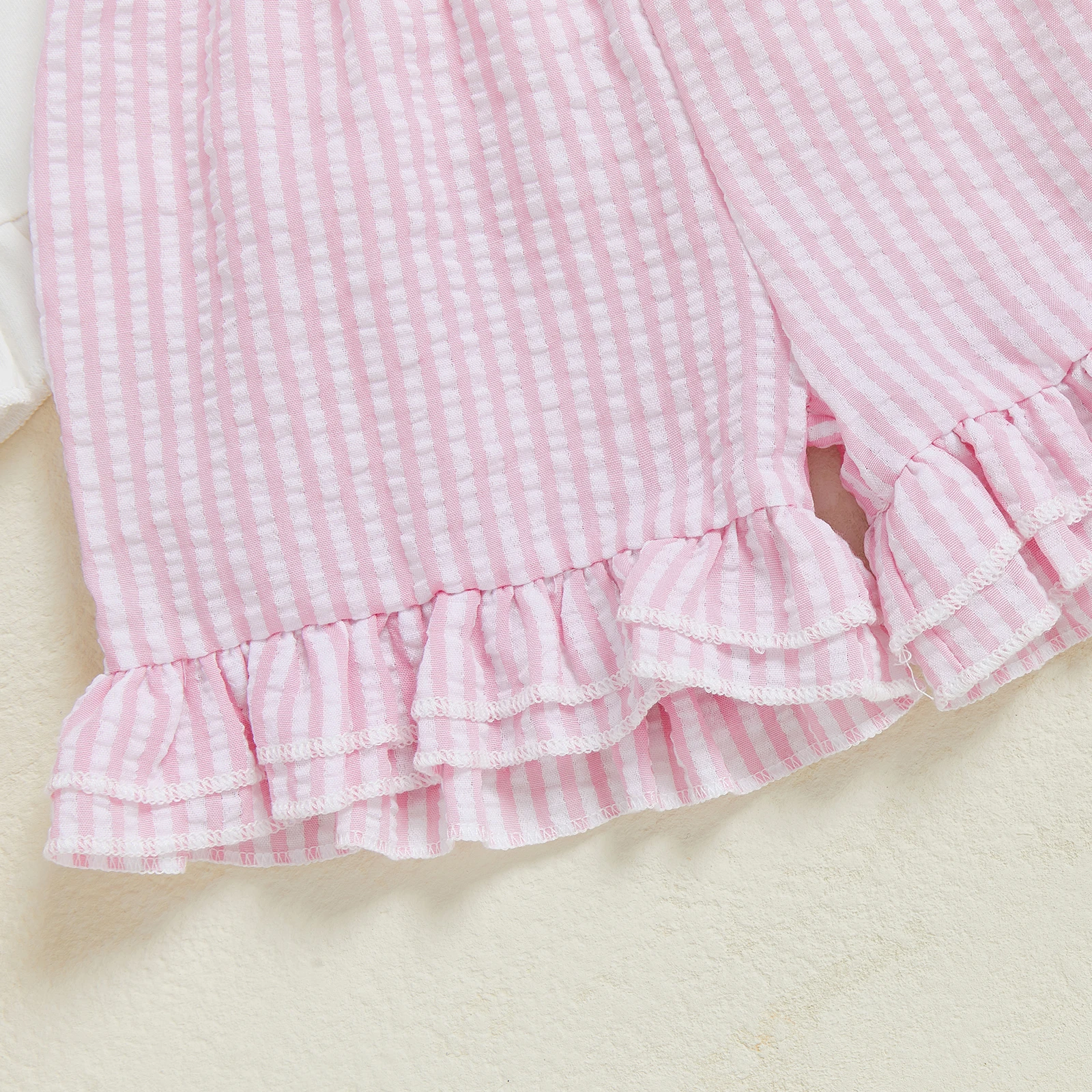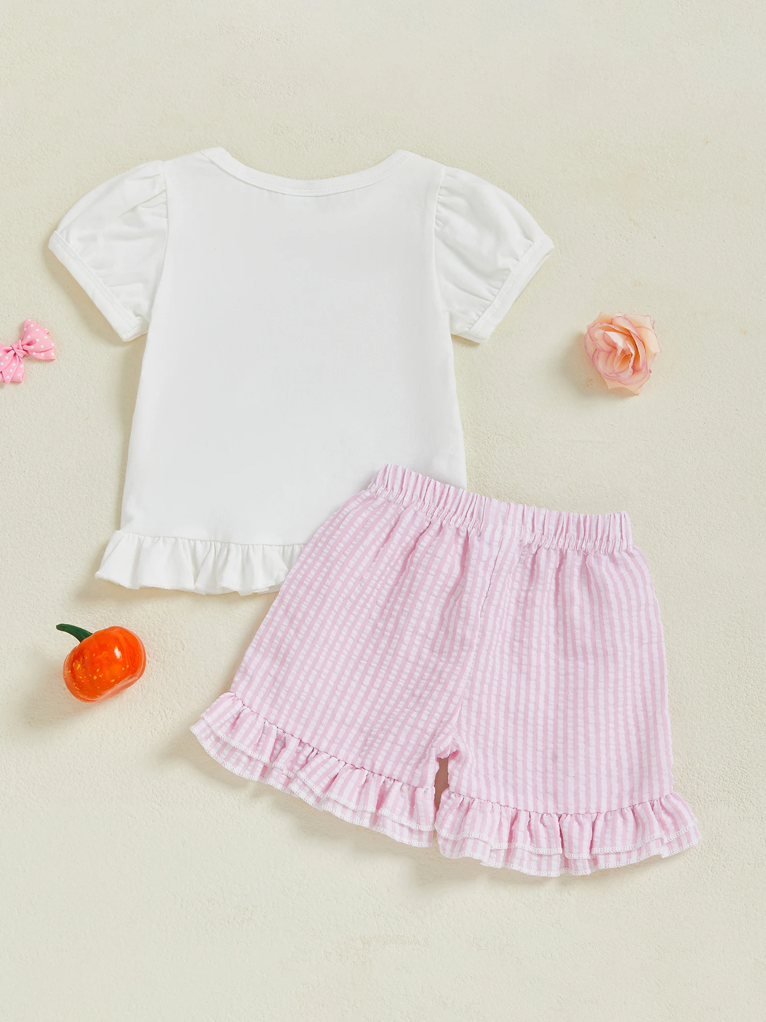 Conjunto de 2 piezas para bebé niña, traje de Halloween con lazo y calabaza bordada, Tops de manga corta, pantalones cortos con volantes en la cintura elástica a rayas