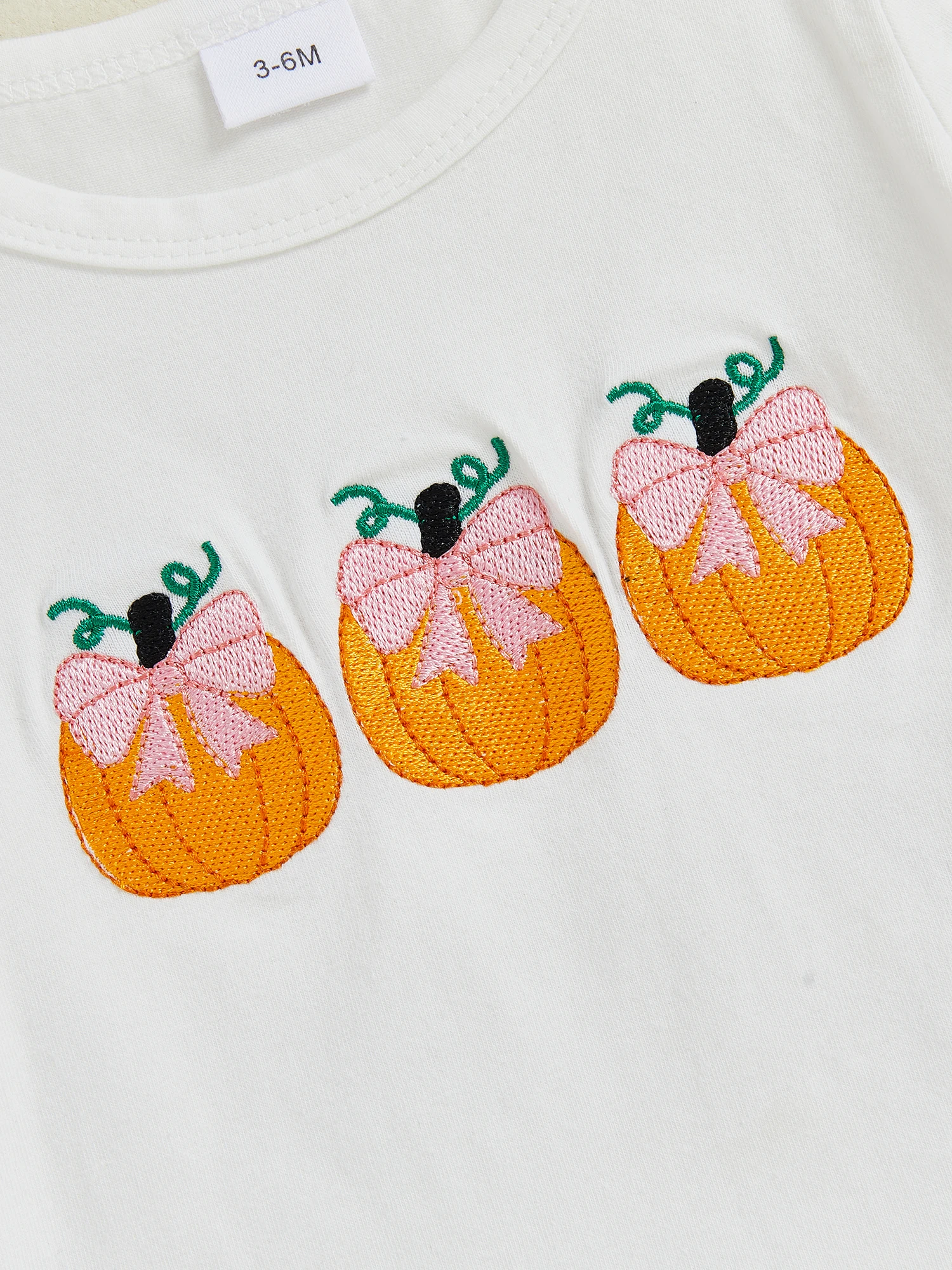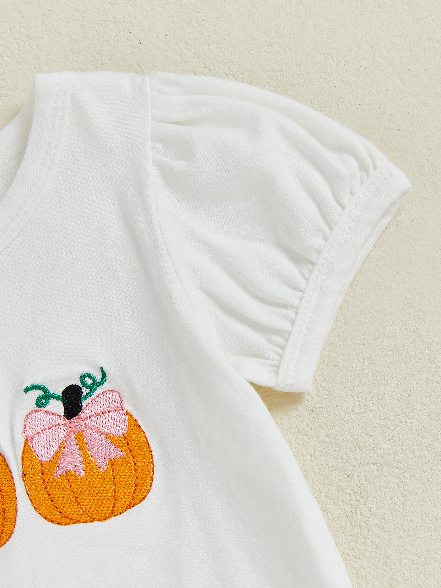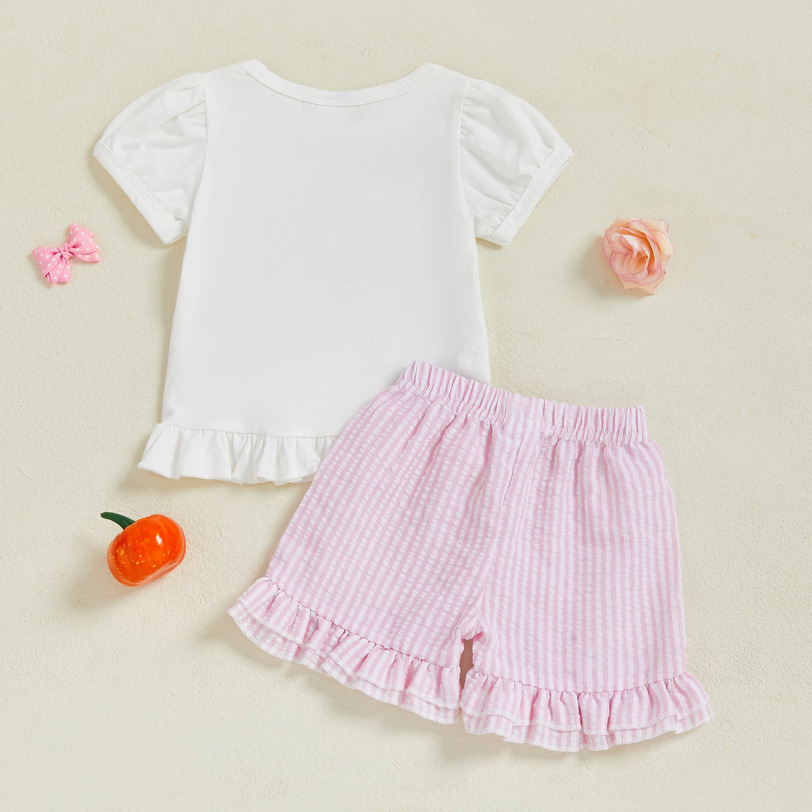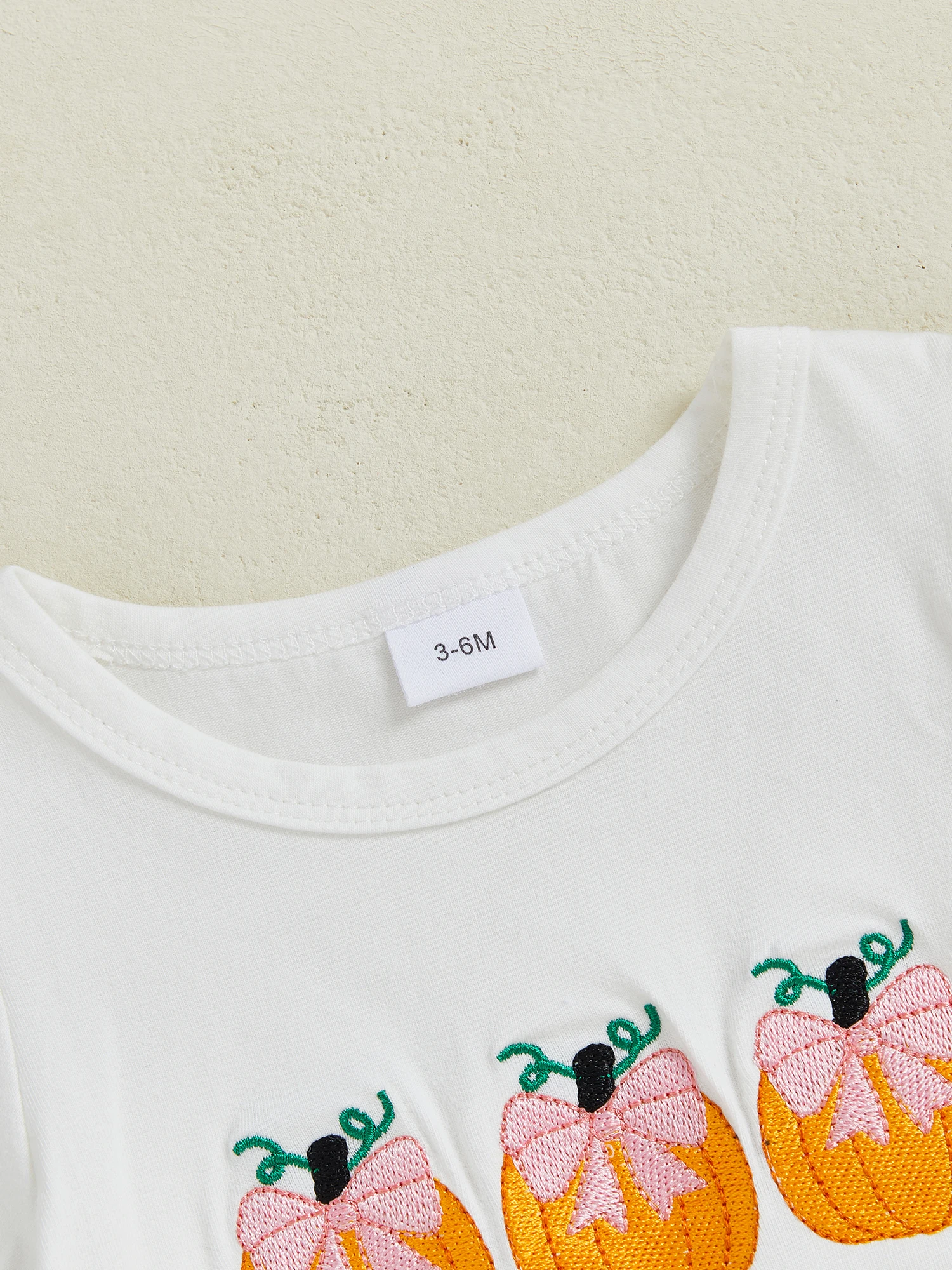 VISgogo Traje de Halloween para niña pequeña con lazo de calabaza bordado Tops de manga corta Pantalones cortos con volantes y cintura elástica a rayas 2 piezas