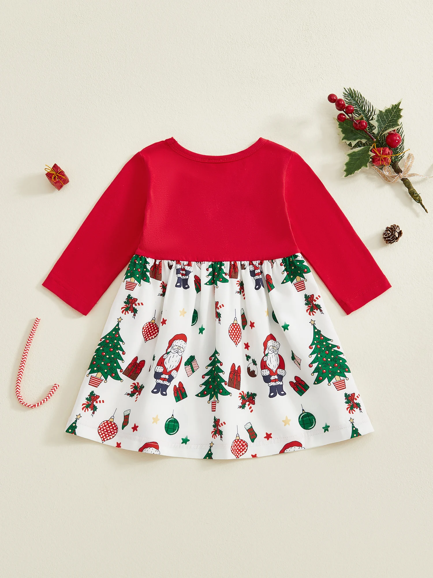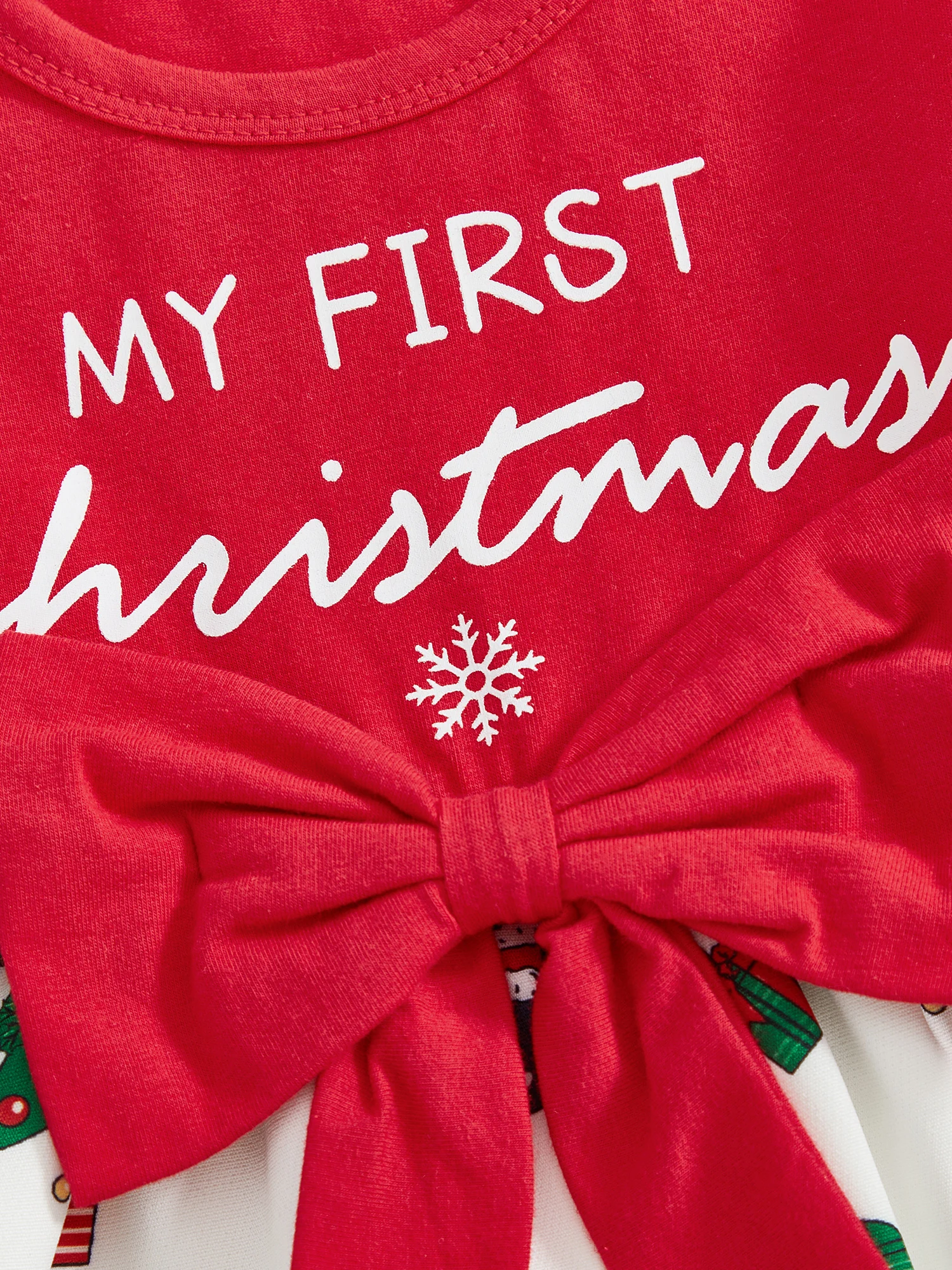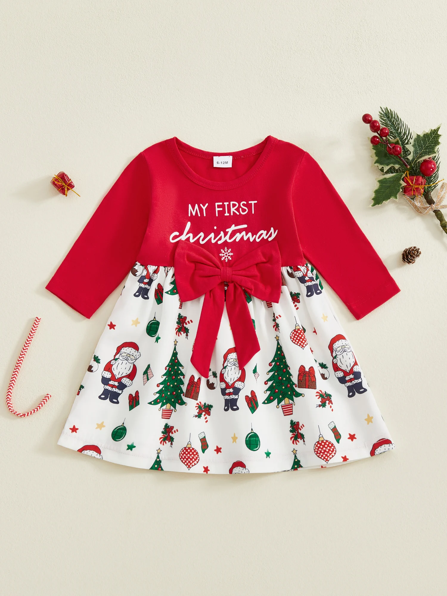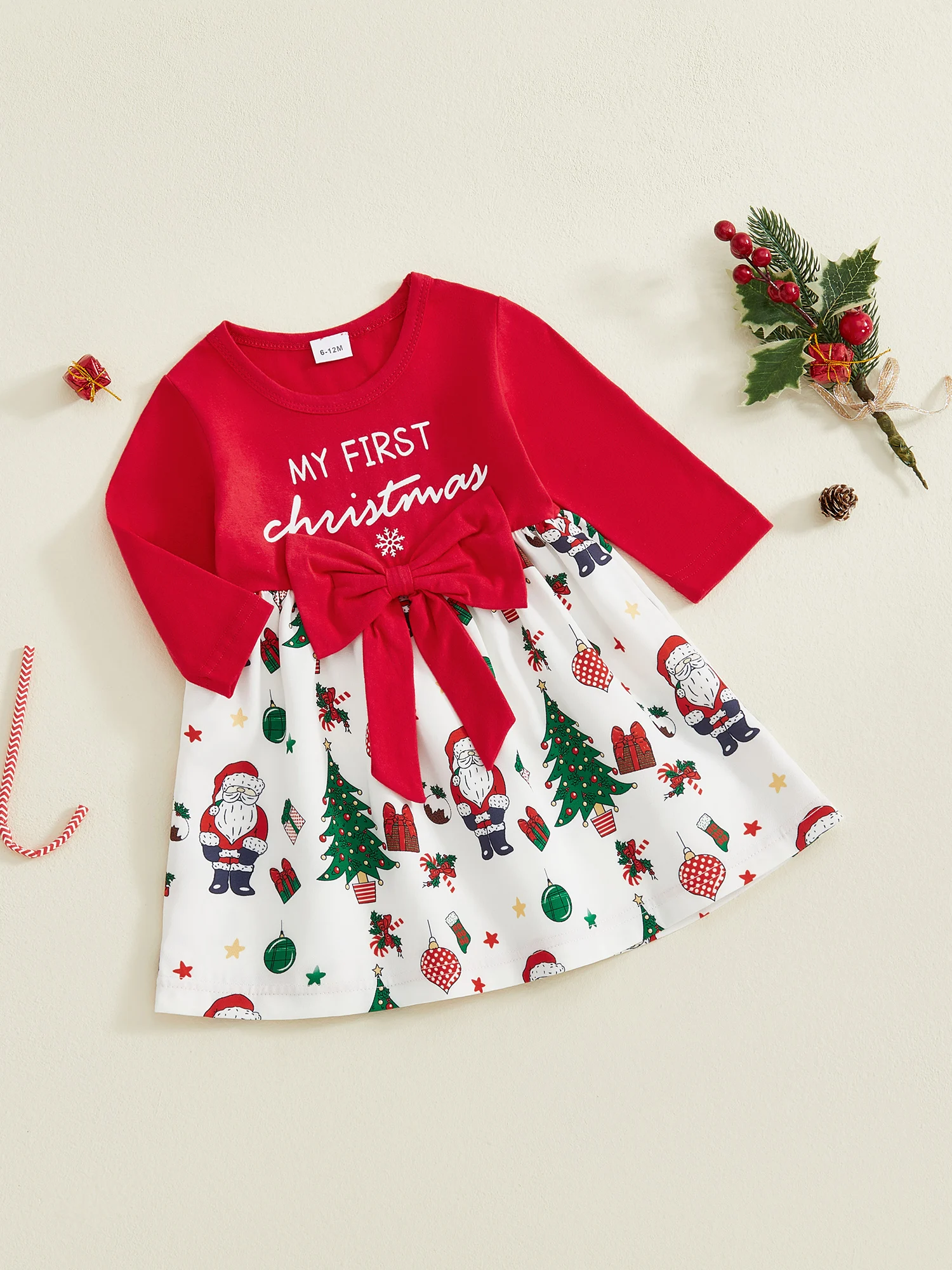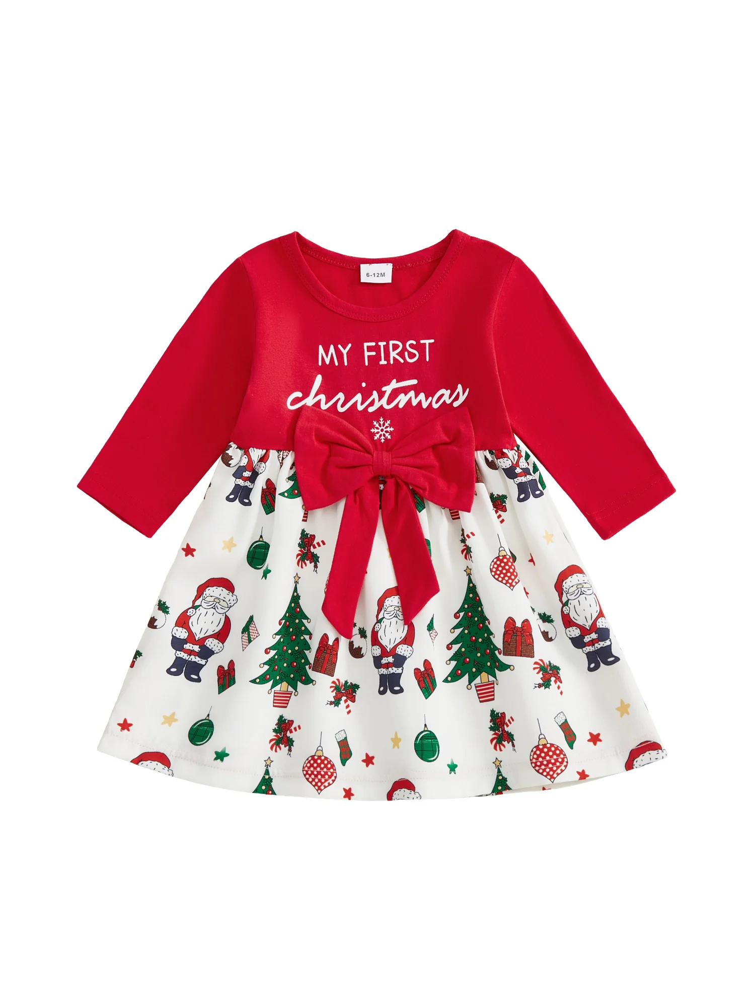 Vestido de Navidad para niña pequeña, manga larga, cuello redondo, lazo frontal, vestido suelto, traje de vacaciones