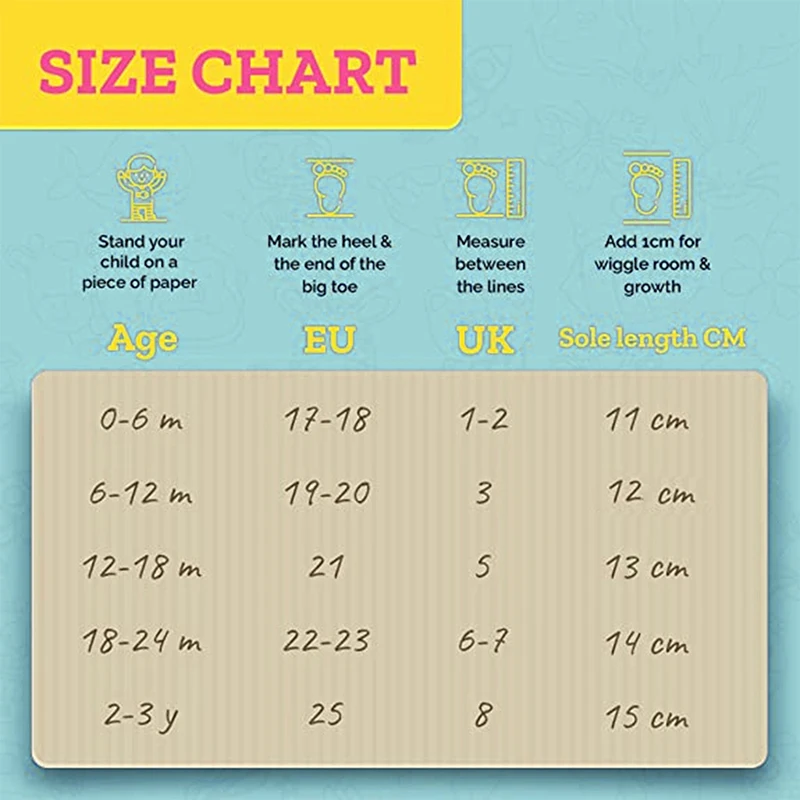 Tamaño (pulgadas) 1 Longitud de la suela: 4,33 Edad recomendada: 0-6 meses 2 Longitud de la suela: 4,72 Edad recomendada: 6-12 meses 3 Longitud de la suela: 5.12 Edad recomendada: 12-18 meses