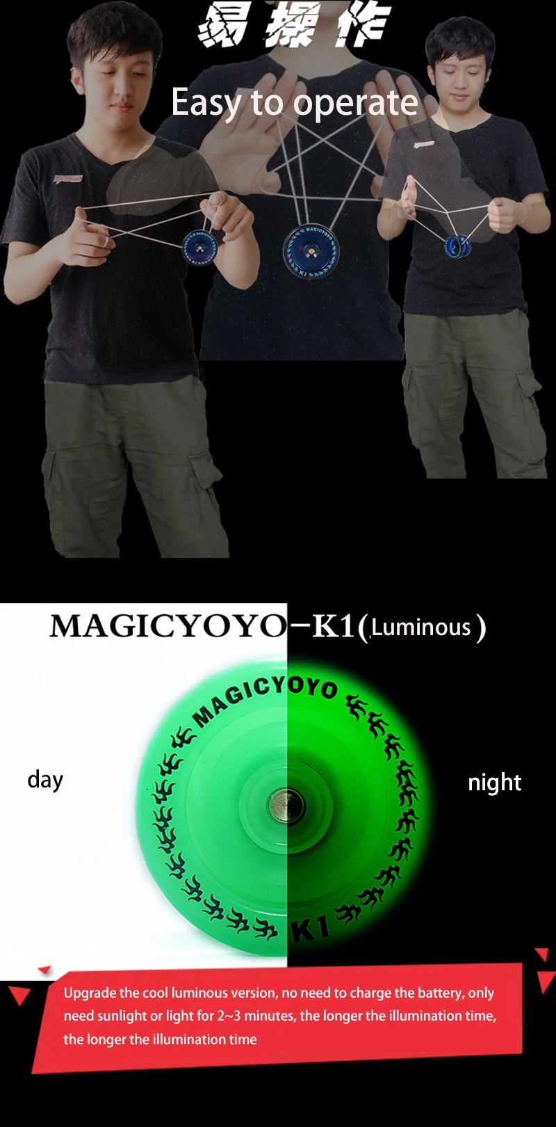 1.K1 es una de las pocas bolas de plástico de MAGIYCYOYO. Es un yo-yo diseñado para principiantes. Aunque está hecho de material plástico, está hecho en estricta conformidad con el estándar de bolas de aleación. Deje que la bola de plástico de bajo costo tenga la sensación de una bola de aleación profesional.