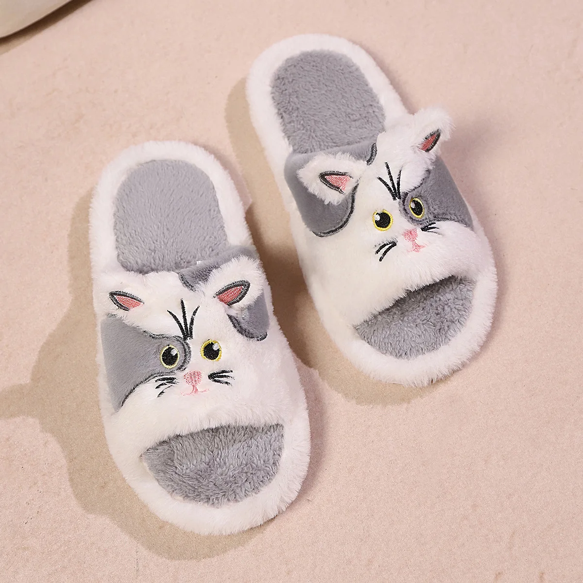 Zapatillas mullidas de interior para mujer, zapatos cálidos de piel sintética con punta abierta para el suelo del hogar, estilo lindo gato, chanclas de casa de talla grande para parejas
