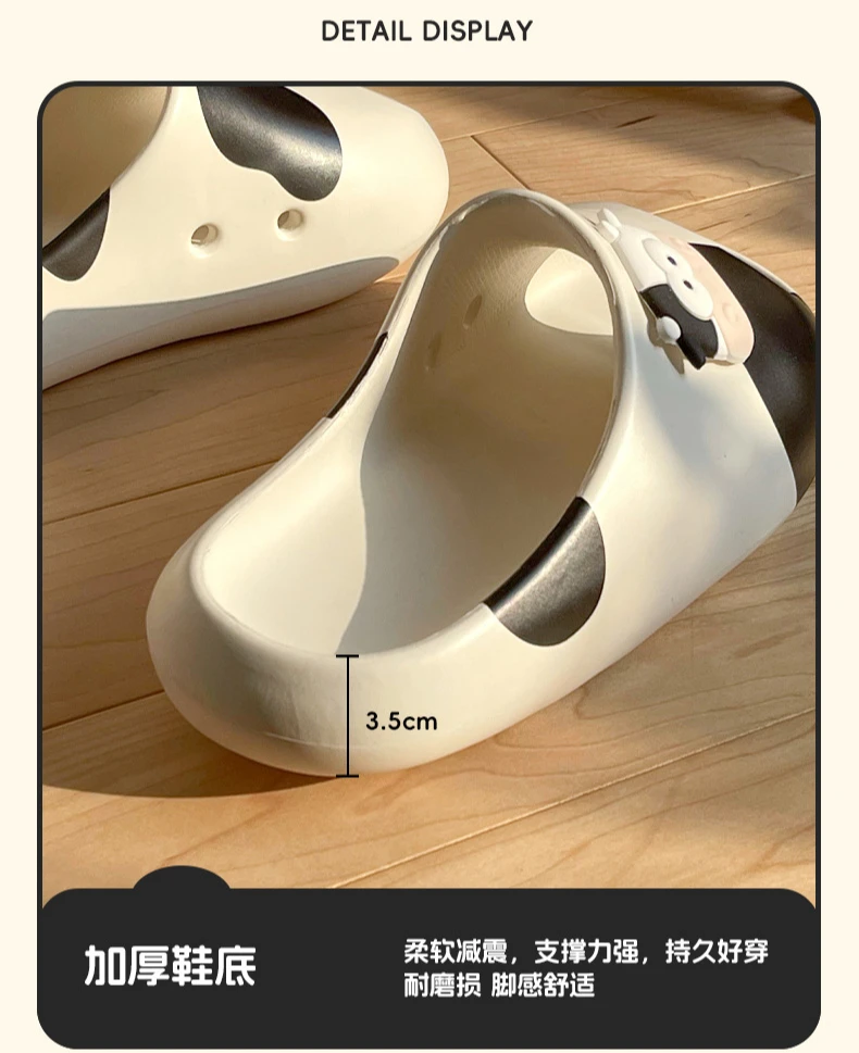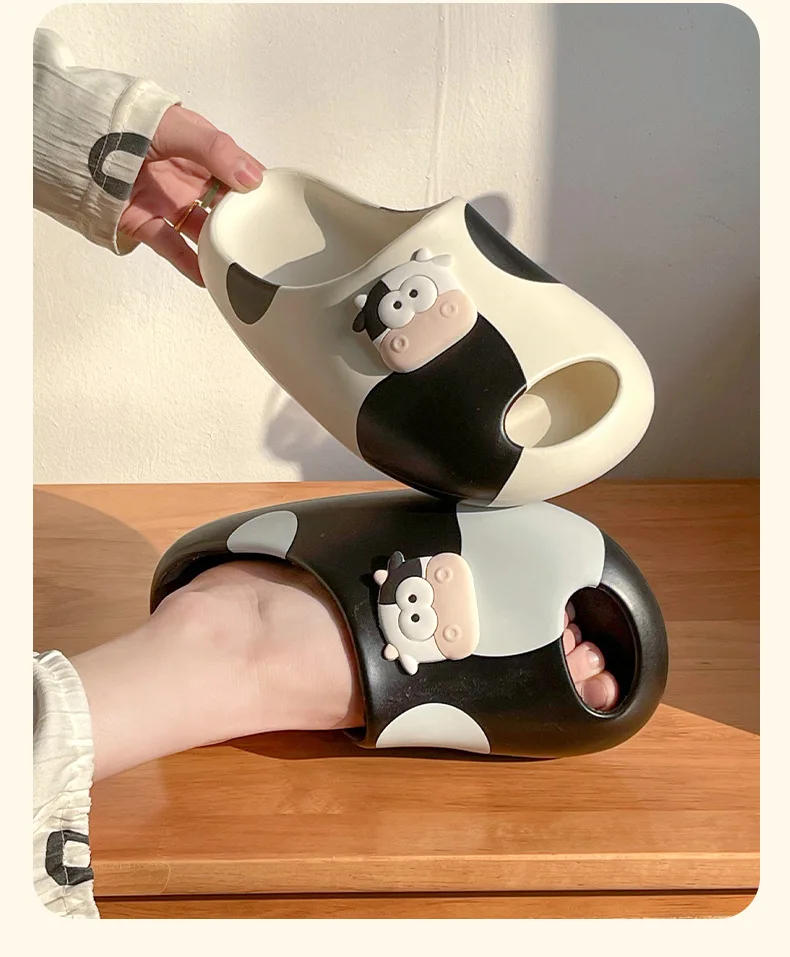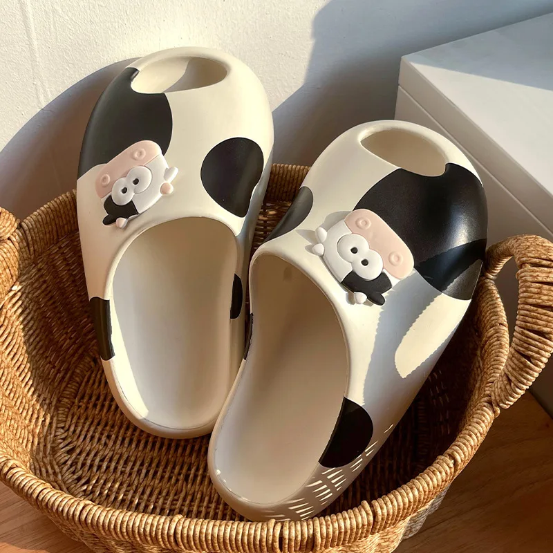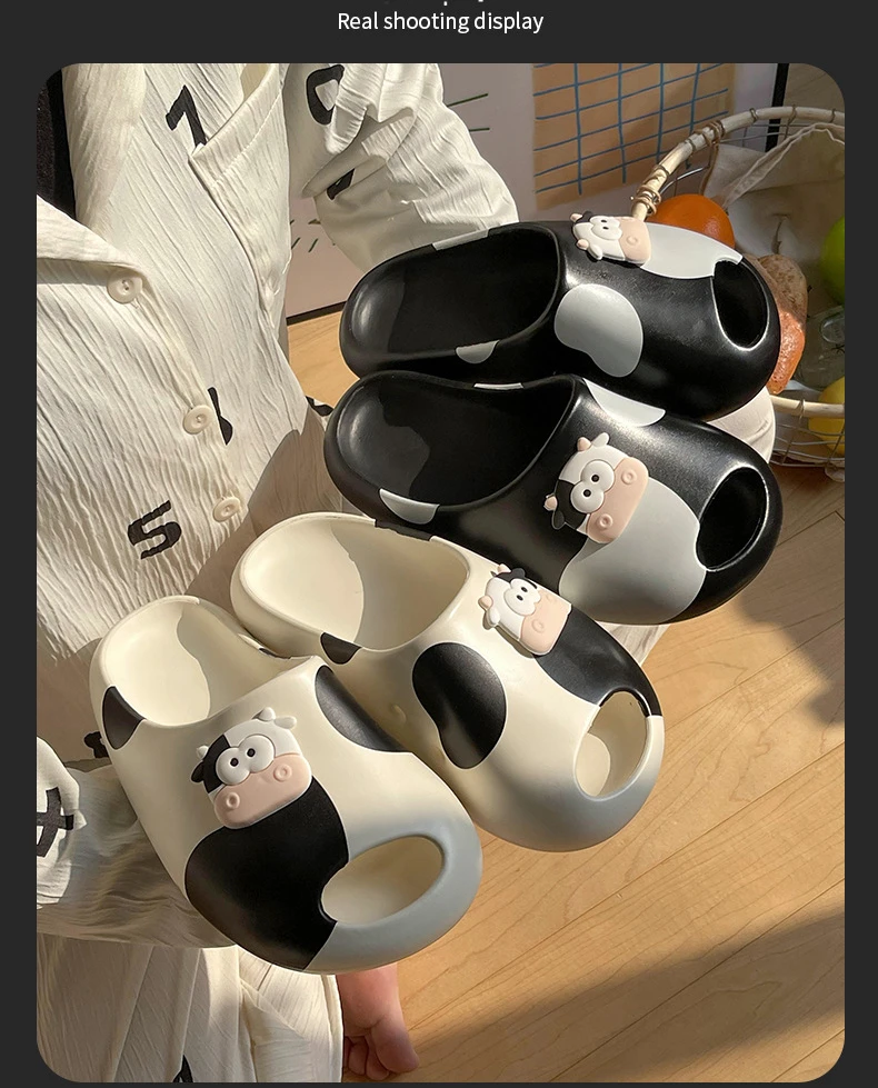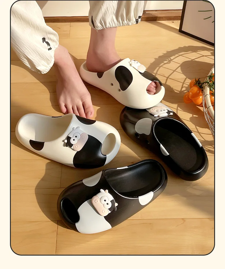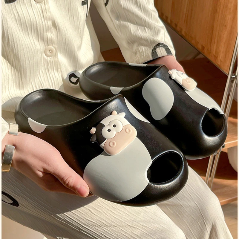 Zapatillas con plataforma interior de vaca de dibujos animados para mujer, zapatos de verano con suela gruesa, antideslizantes, toboganes de ducha para el baño y el hogar