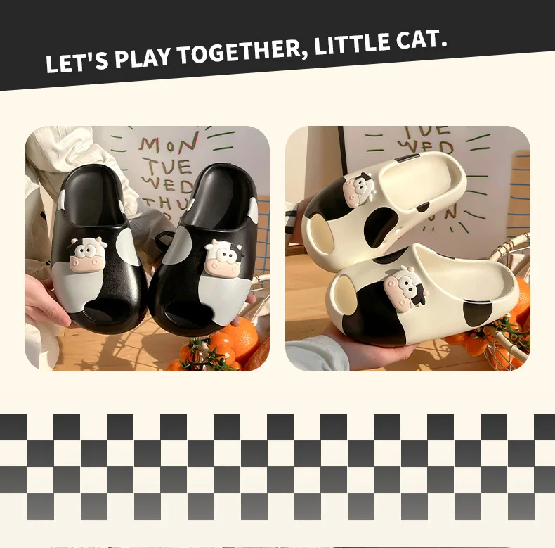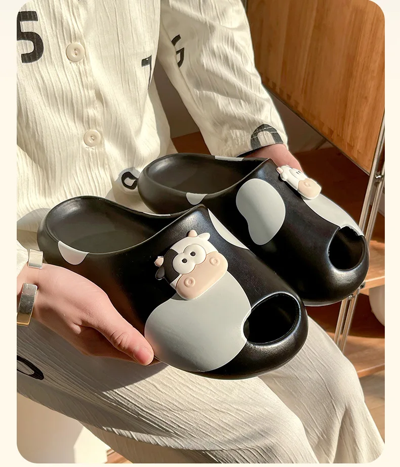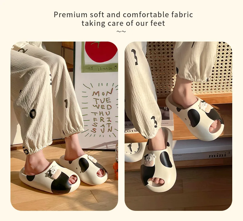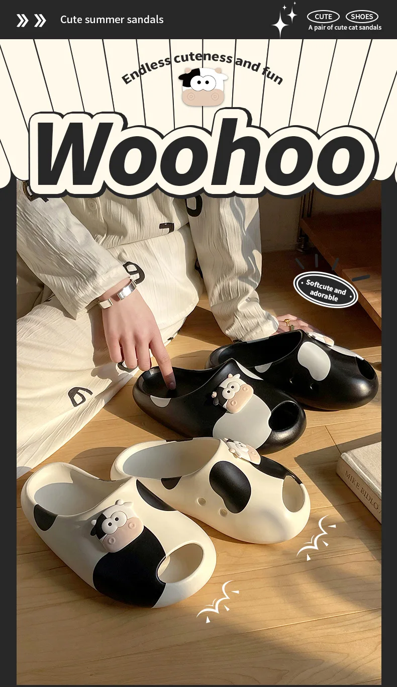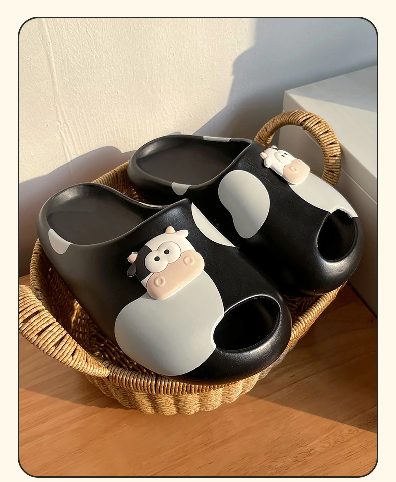 Zapatillas con plataforma interior de vaca de dibujos animados para mujer, zapatos de verano con suela gruesa, antideslizantes, toboganes de ducha para el baño y el hogar
