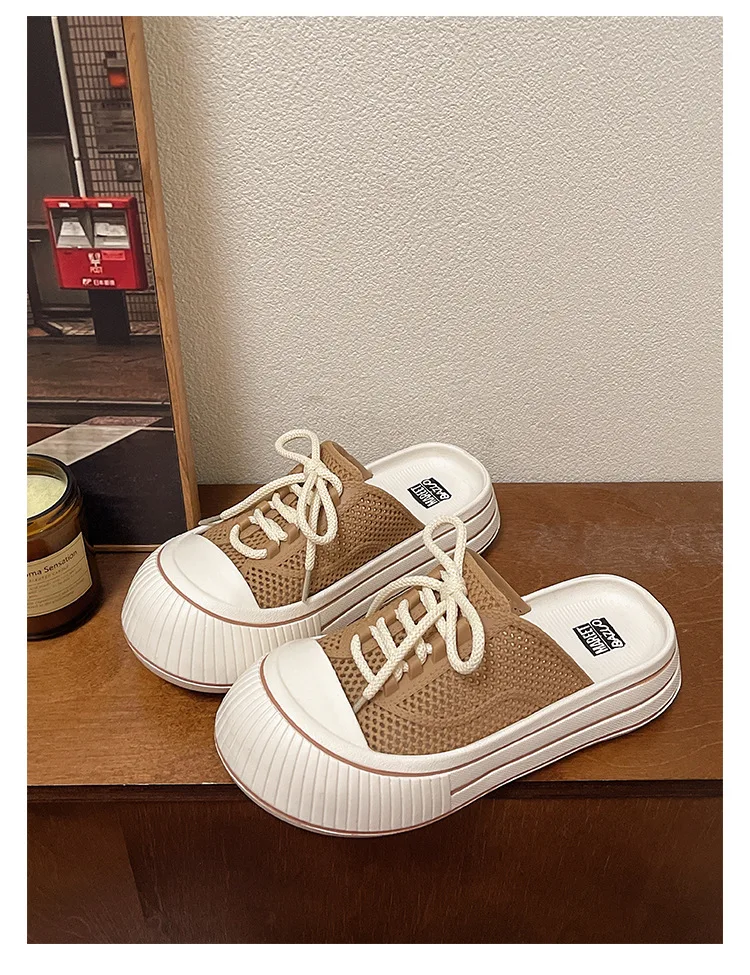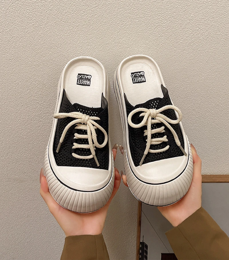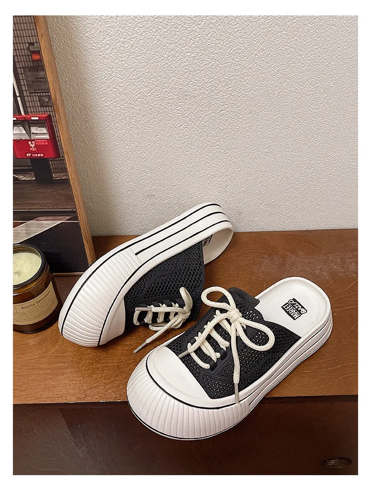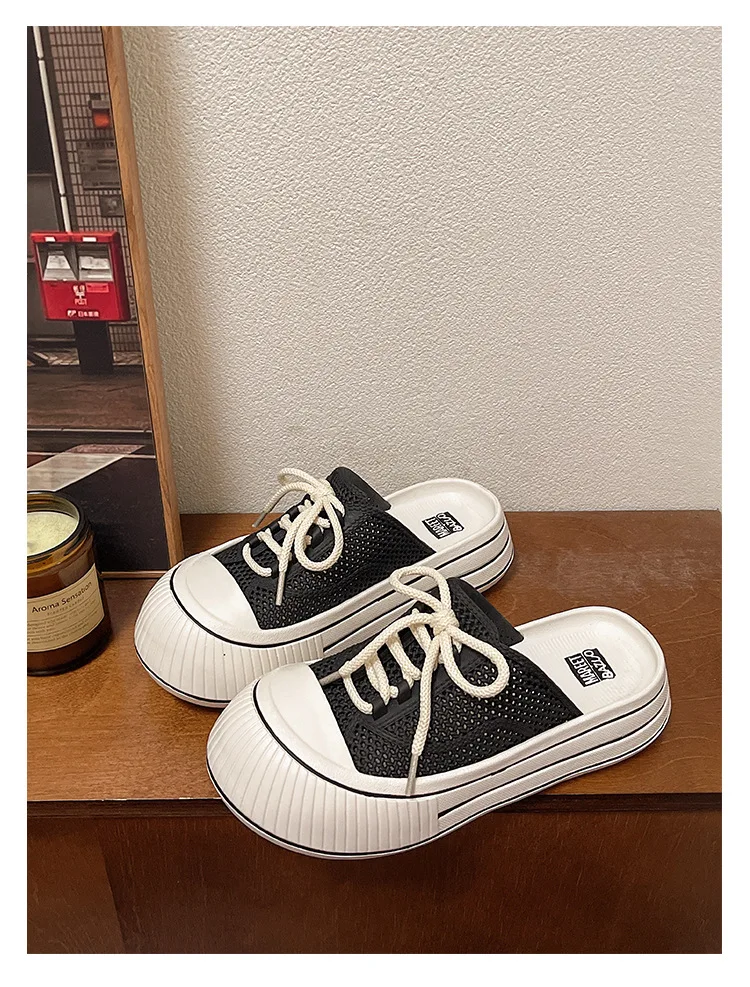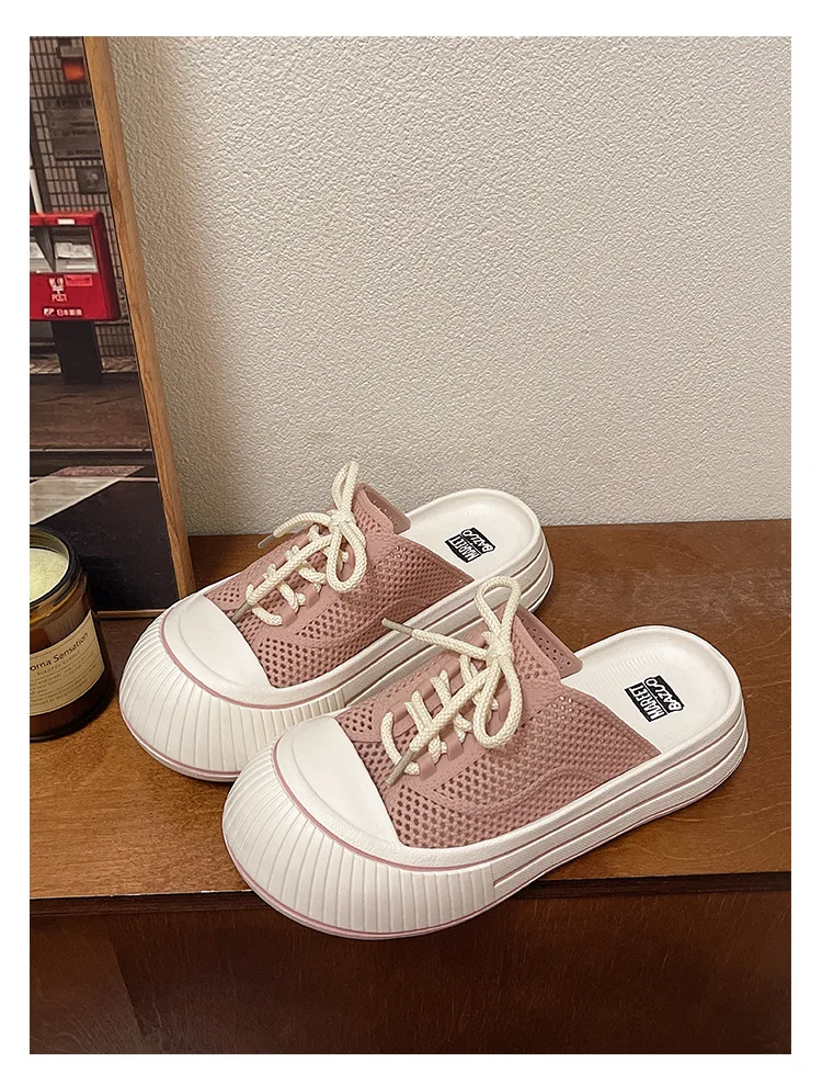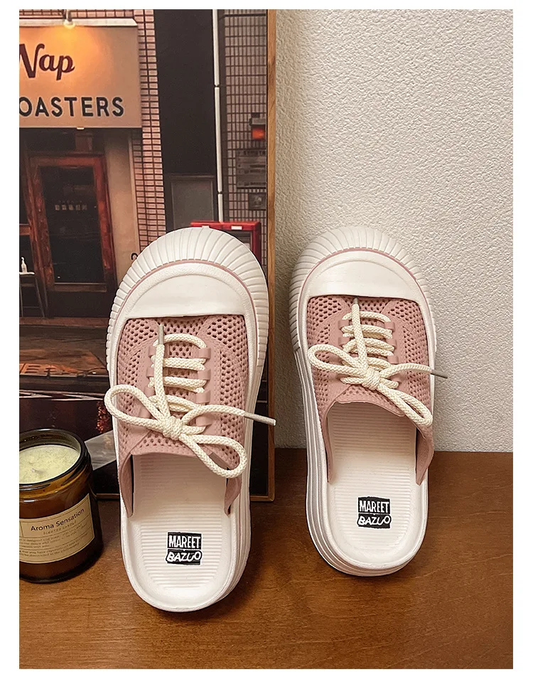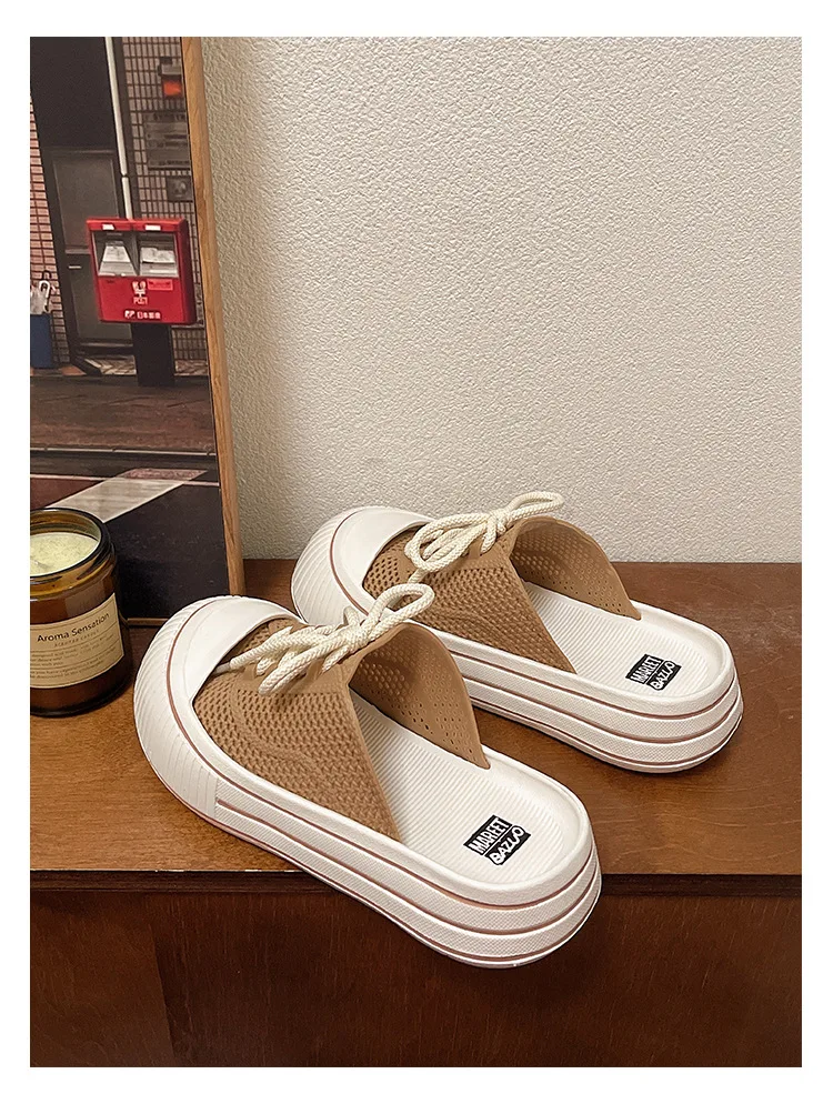 Zapatillas de plataforma de verano con cordones de malla transpirable para mujer, zapatos de calle para el hogar, sandalias sin cordones de estilo coreano con suela gruesa para niñas