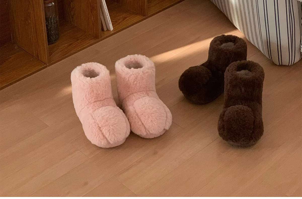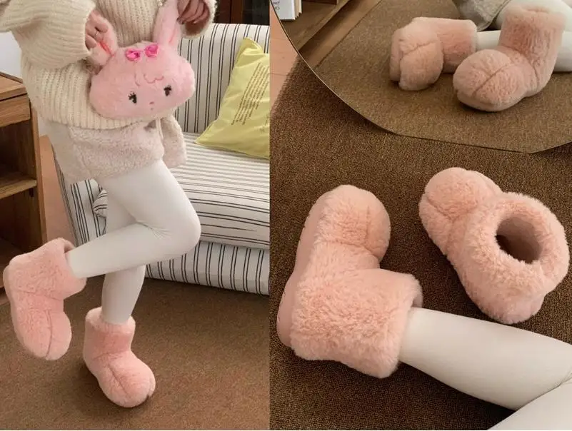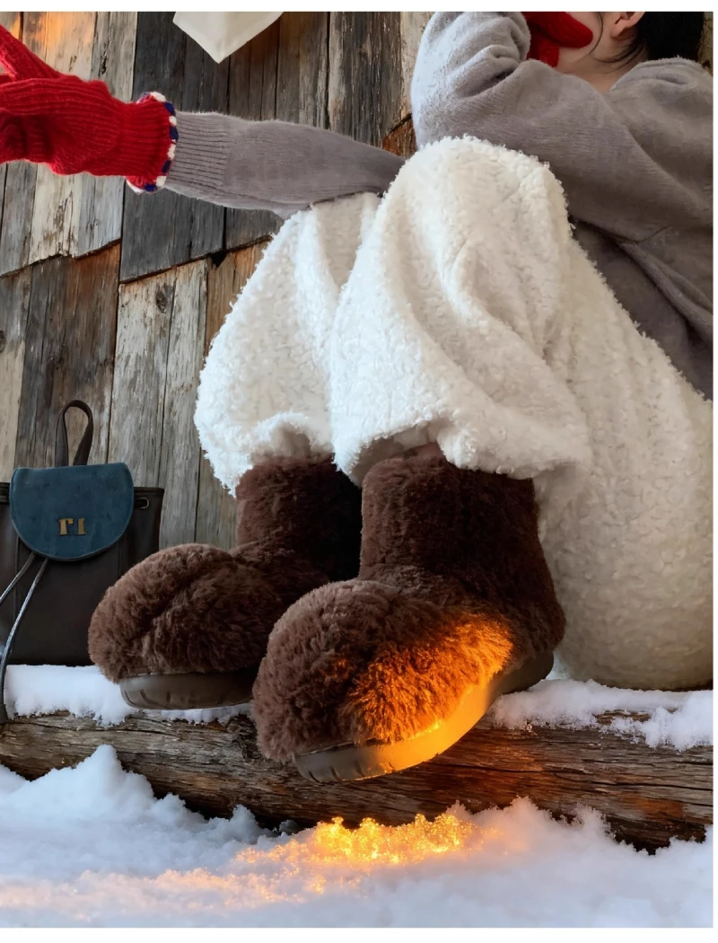 Zapatos de casa esponjosos con pata de gato de dibujos animados para mujer, zapatillas de algodón para interiores, botas de nieve antideslizantes de piel sintética cálidas para el hogar y la calle
