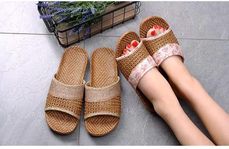Comprar Zapatos de paja transpirables para mujer, zapatillas de interior antideslizantes para amantes del hogar, zapatillas de lino para hombre y mujer, chanclas para el suelo de la casa SH423