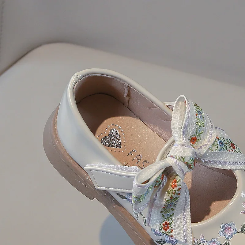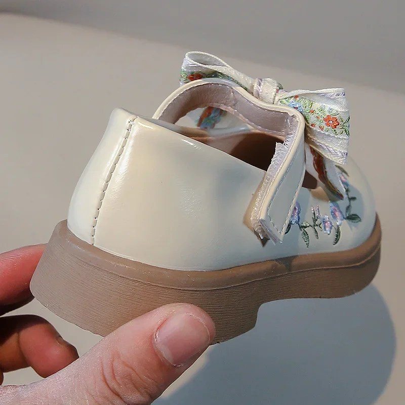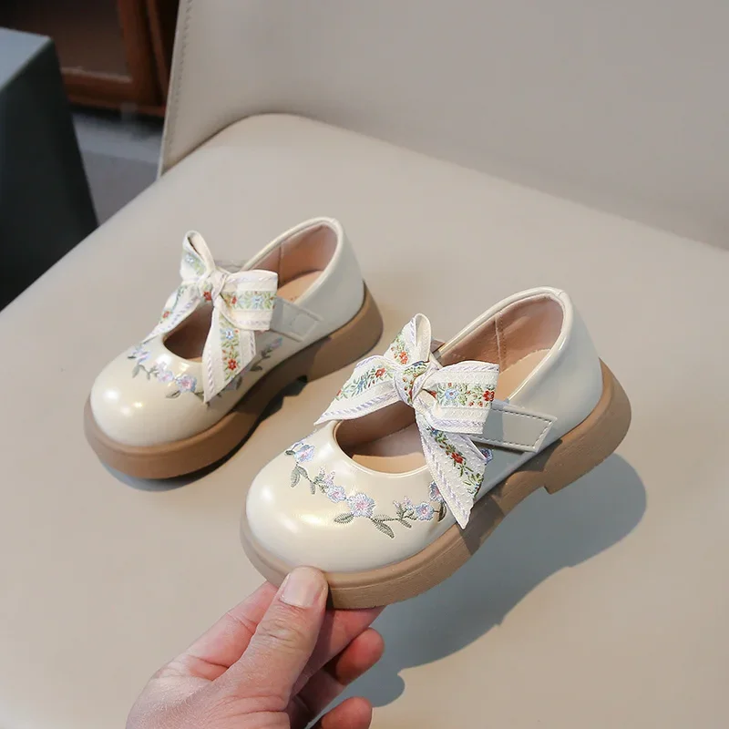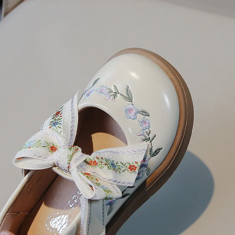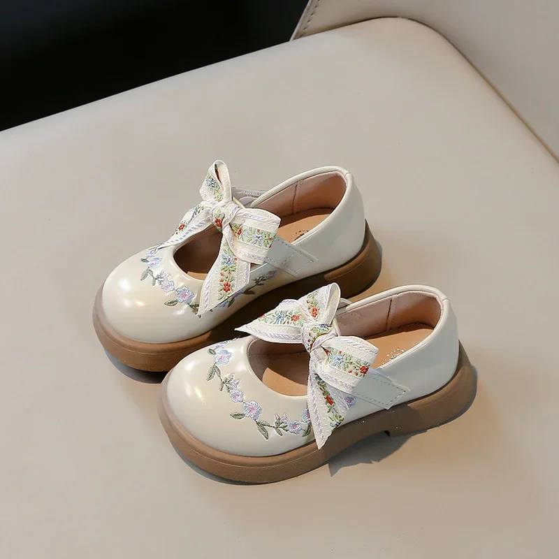 Zapatos pequeños de cuero para niñas, talla 23-35, zapatos individuales con bordado Beige para niñas, zapatos Mary Jane suaves antideslizantes para primavera y otoño
