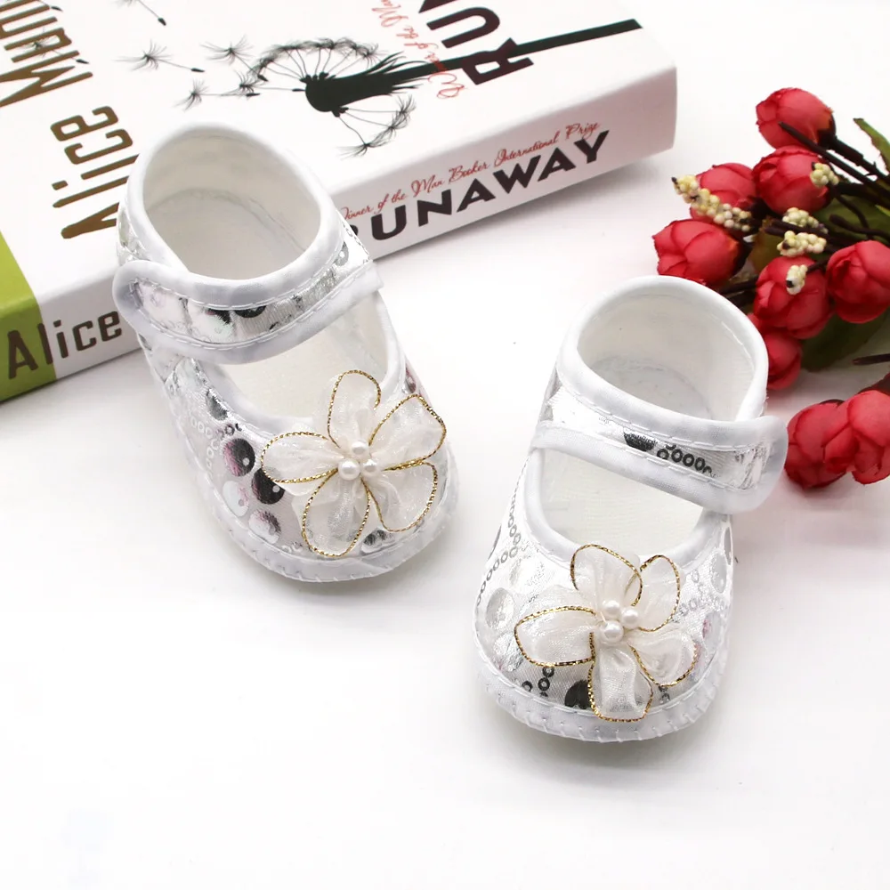Comprar Zapatos planos de flores pequeñas para bebé, calzado antideslizante de fondo suave con flores de perlas, novedad, primavera y otoño
